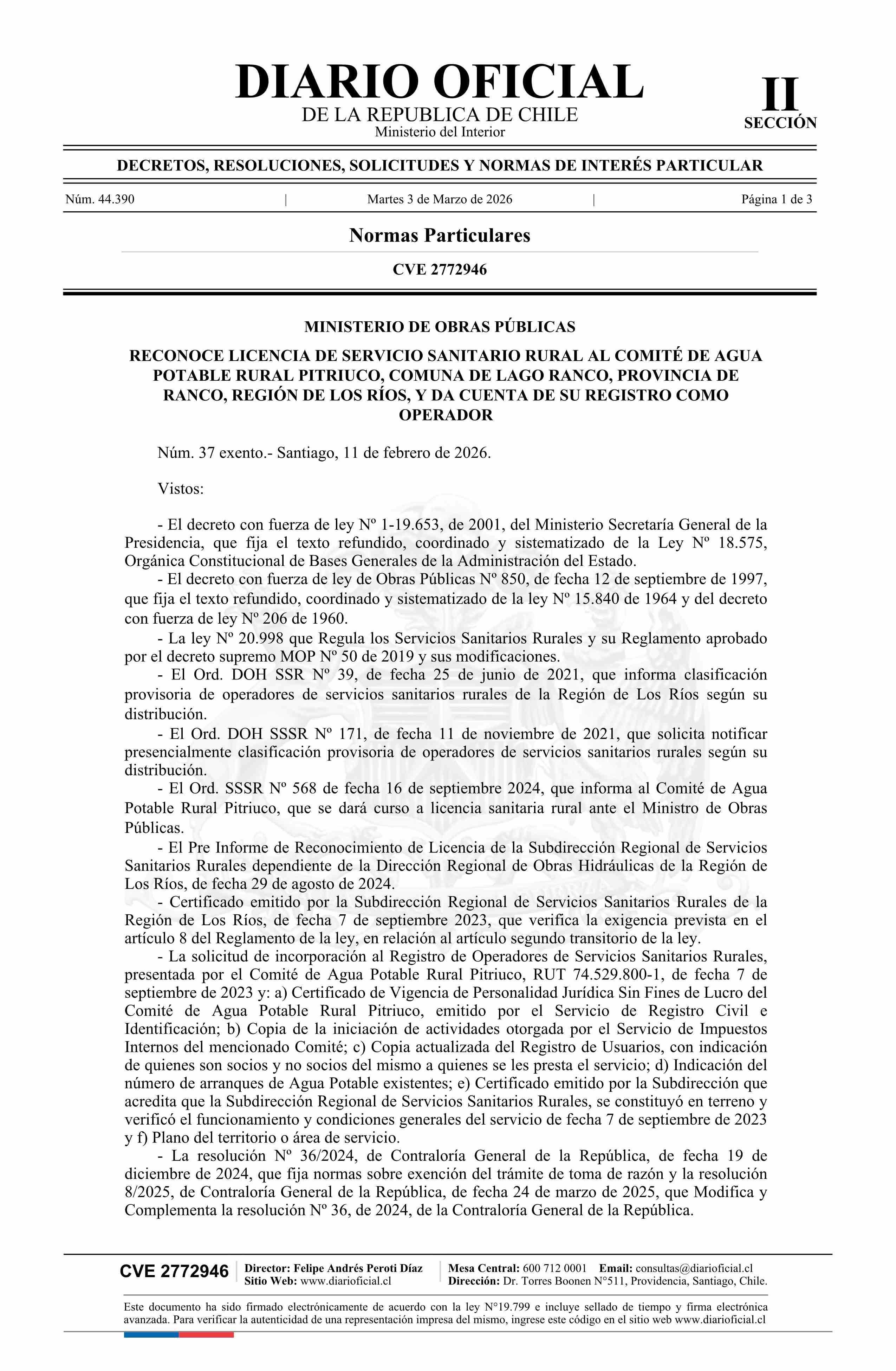 | Título: | Decreto exento número 37, de 2026.- Reconoce licencia de servicio sanitario rural al Comité de Agua Potable Rural Pitriuco, comuna de Lago Ranco, provincia de Ranco, Región de Los Ríos, y da cuenta de su registro como operador |