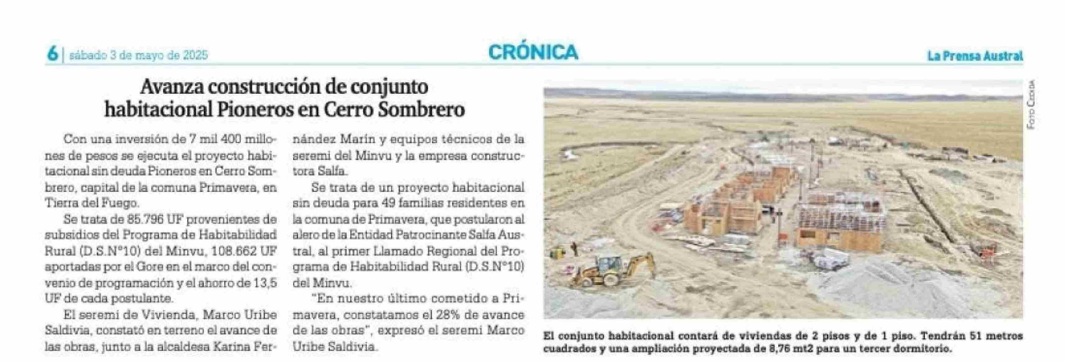 | Título: | Avanza construcción de conjunto habitacional Pioneros en Cerro Sombrero |