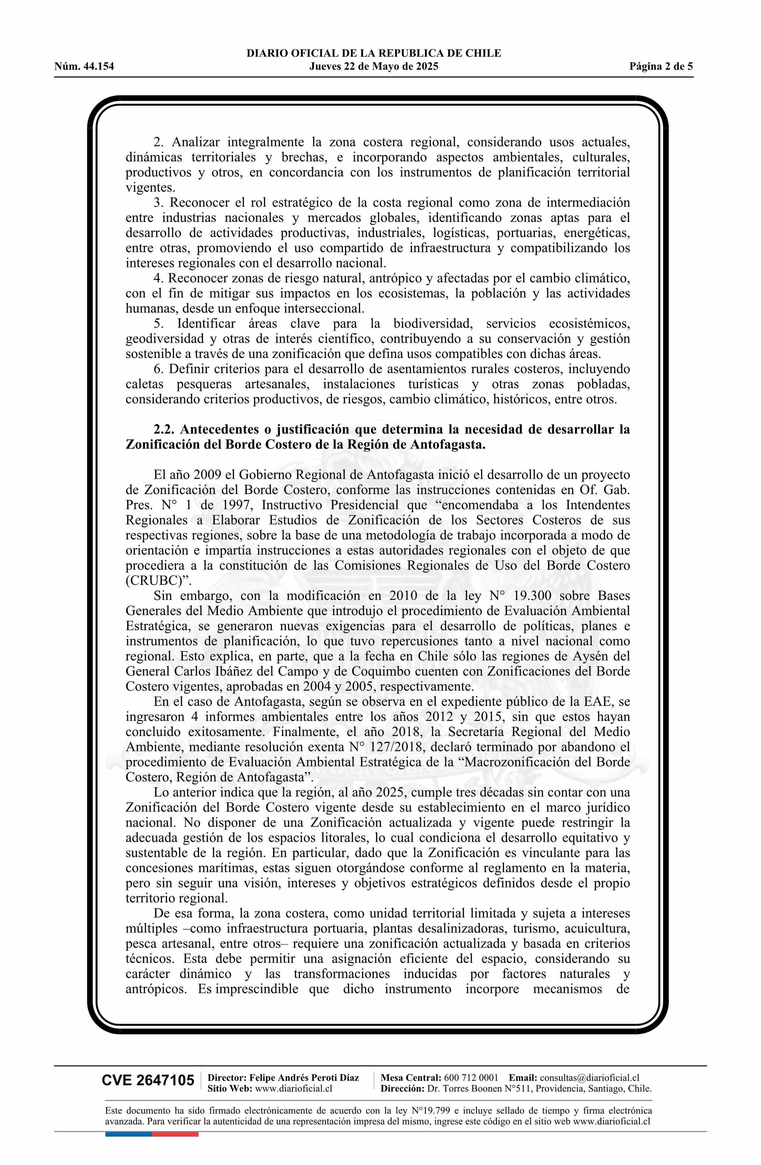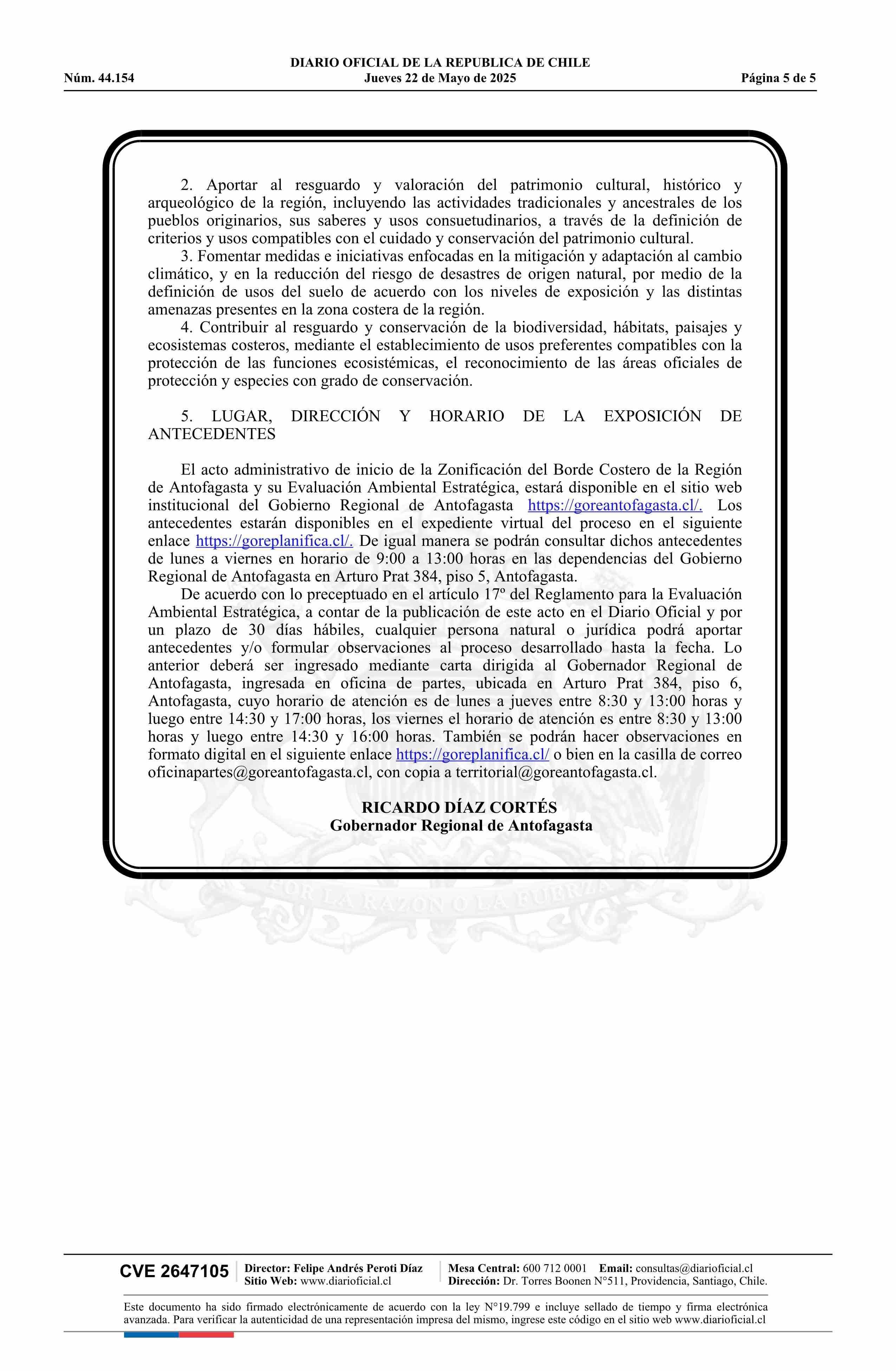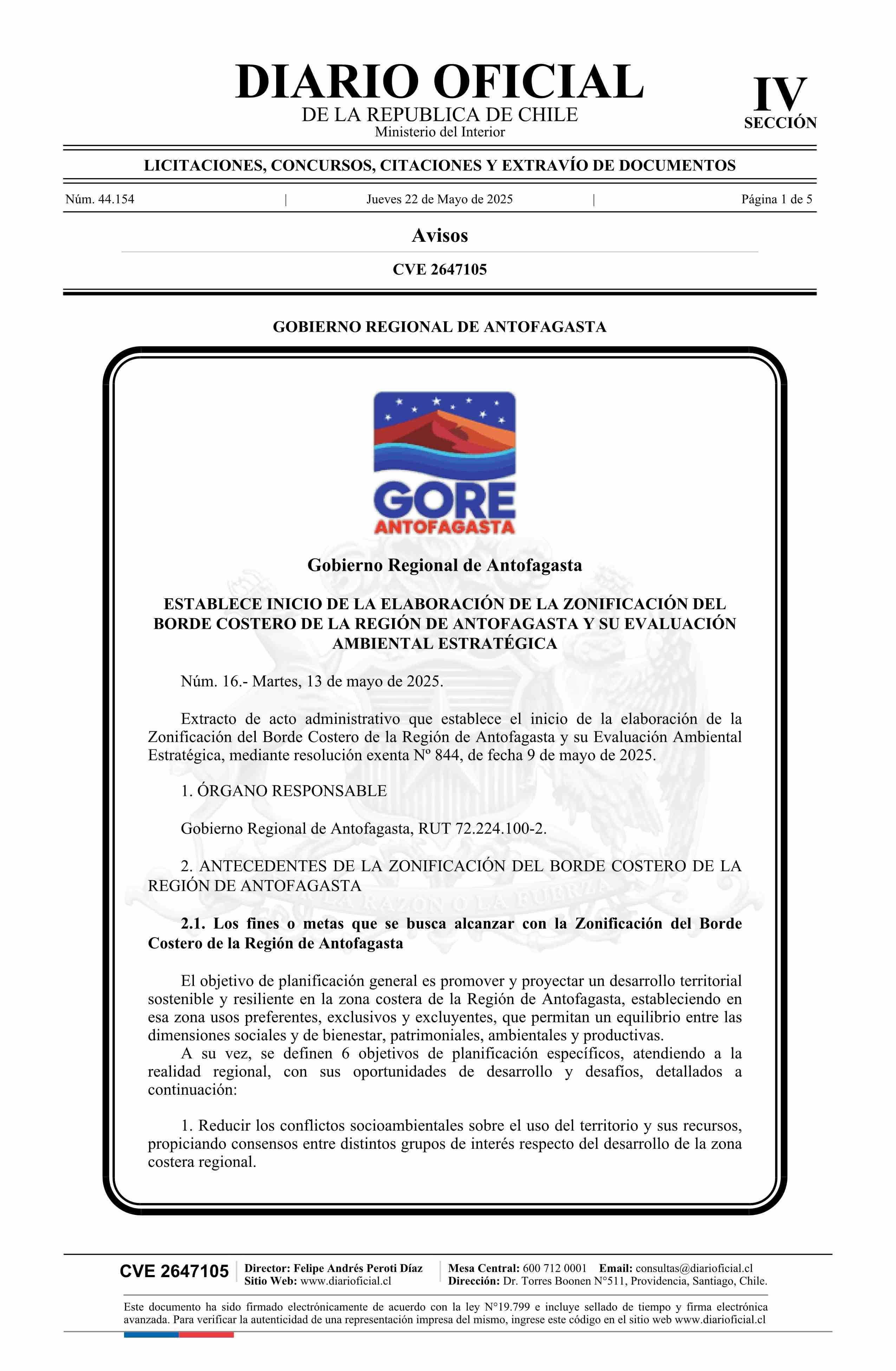 AVISO LICITACIONES: Inicia elaboración de la Zonificación del Borde Costero de la Región de Antofagasta y su Evaluación Ambiental Estratégica 22-05-2025 Diario Oficial Edición Electrónica |