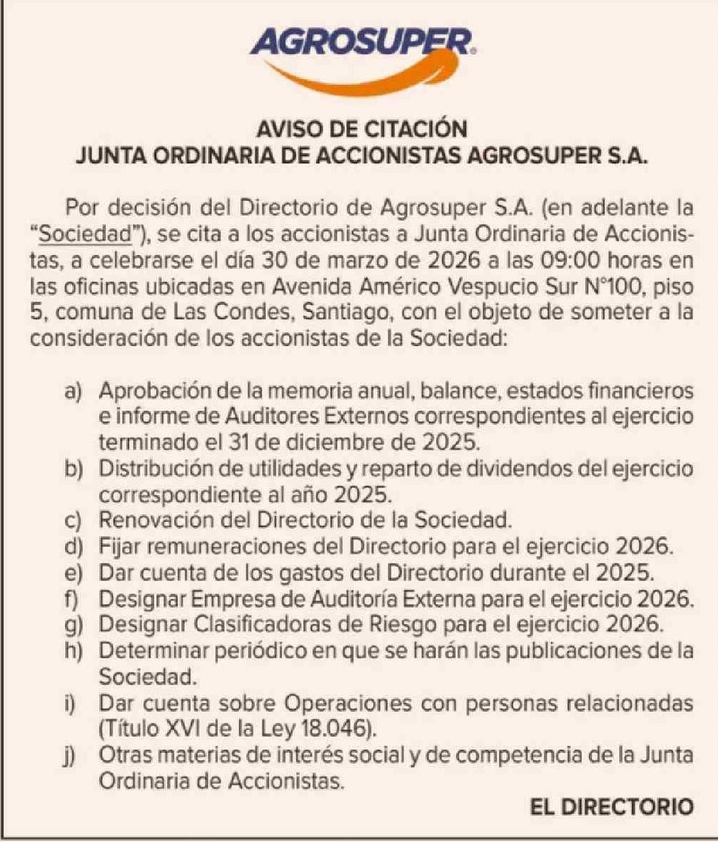 EXTRACTO CITACIÓN JUNTA ORDINARIA DE ACCIONISTAS EMPRESAS AQUACHILE S.A. 23-03-2026 Diario Financiero |