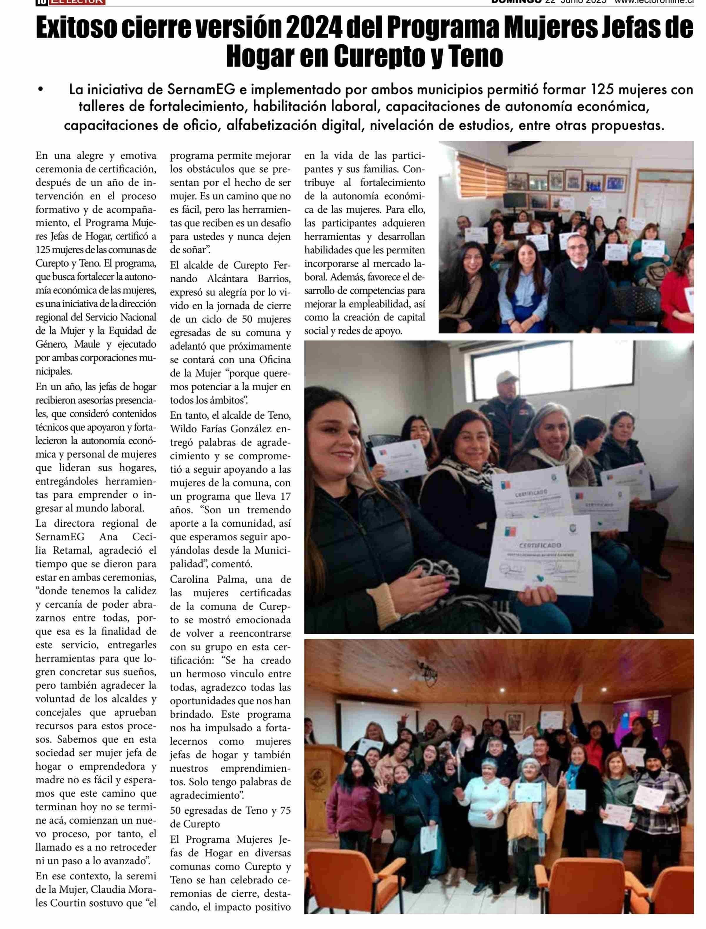 EXItosO cierre versión 2024 del Programa Mujeres Jefas de Hogar en Curepto y Teno 24-06-2025 El Lector |