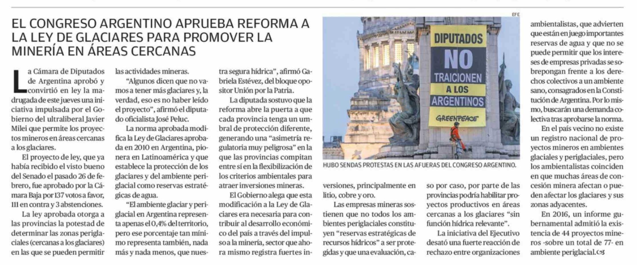 EL CONGRESO ARGENTINO APRUEBA REFORMA ALA LEY DE GLACIARES PARA PROMOVER LA MINERÍA EN ÁREAS CERCANAS 12-04-2026 El Mercurio de Antofagasta |
