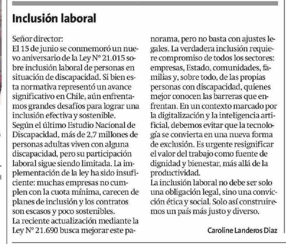 Cartas: Inclusión laboral 19-06-2025 La Estrella de Antofagasta |
