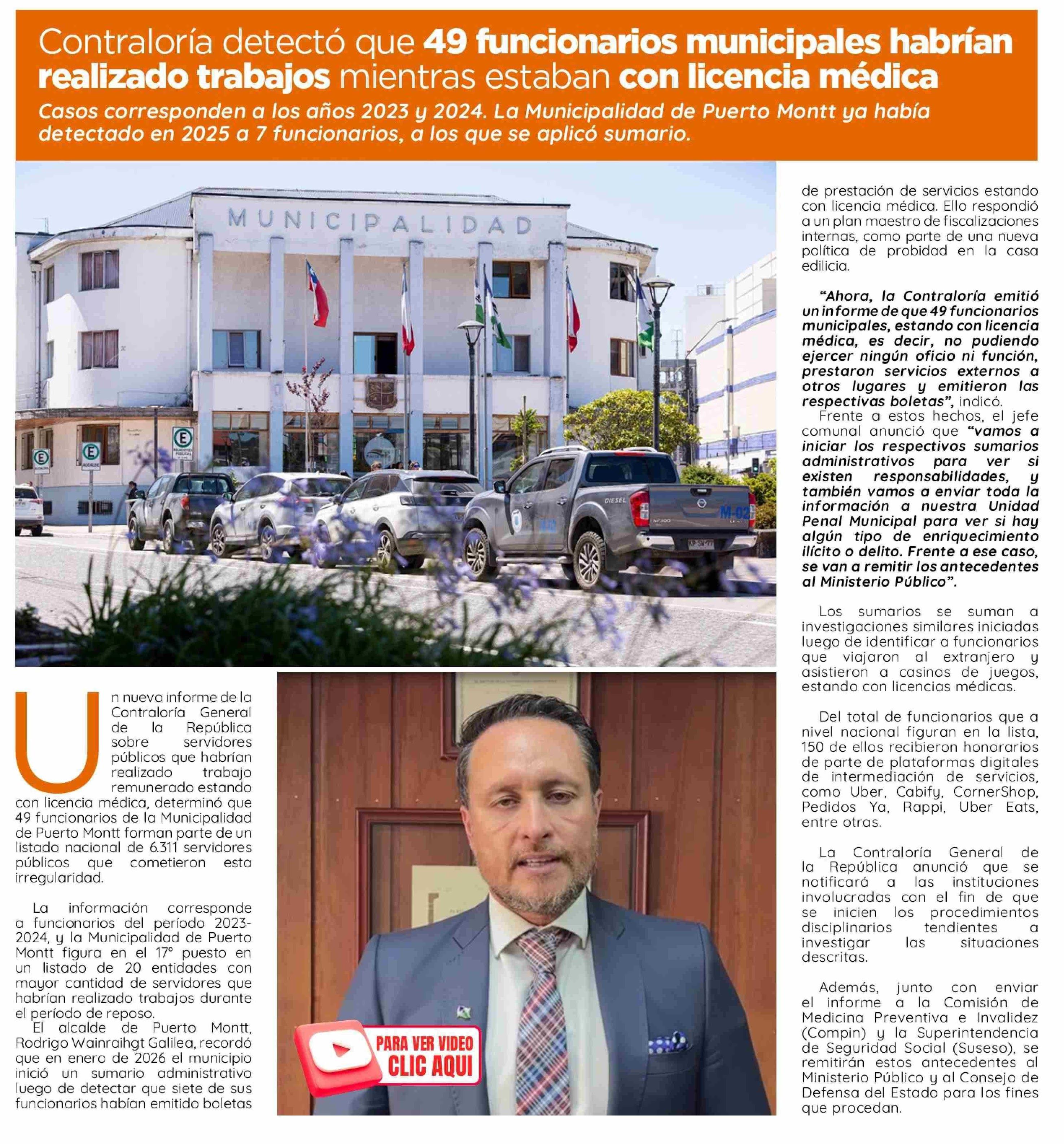 Contraloría detectó que 49 funcionarios municipales habrían realizado trabajos mientras estaban con licencia médica 01-04-2026 El Insular |