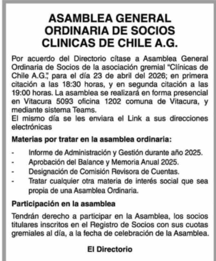Extractos: ASAMBLEA GENERAL ORDINARIA DE SOCIOS CLINICAS DE CHILE A.G. Por acuerdo del Directorio cítase a Asamblea General Ordinaria de Socios de la asociación gremial "Clínicas de Chile A.G.", para el día 23 de abril del 2026; en primera citación a las 18:30 horas, y en segunda citación a las 19:0