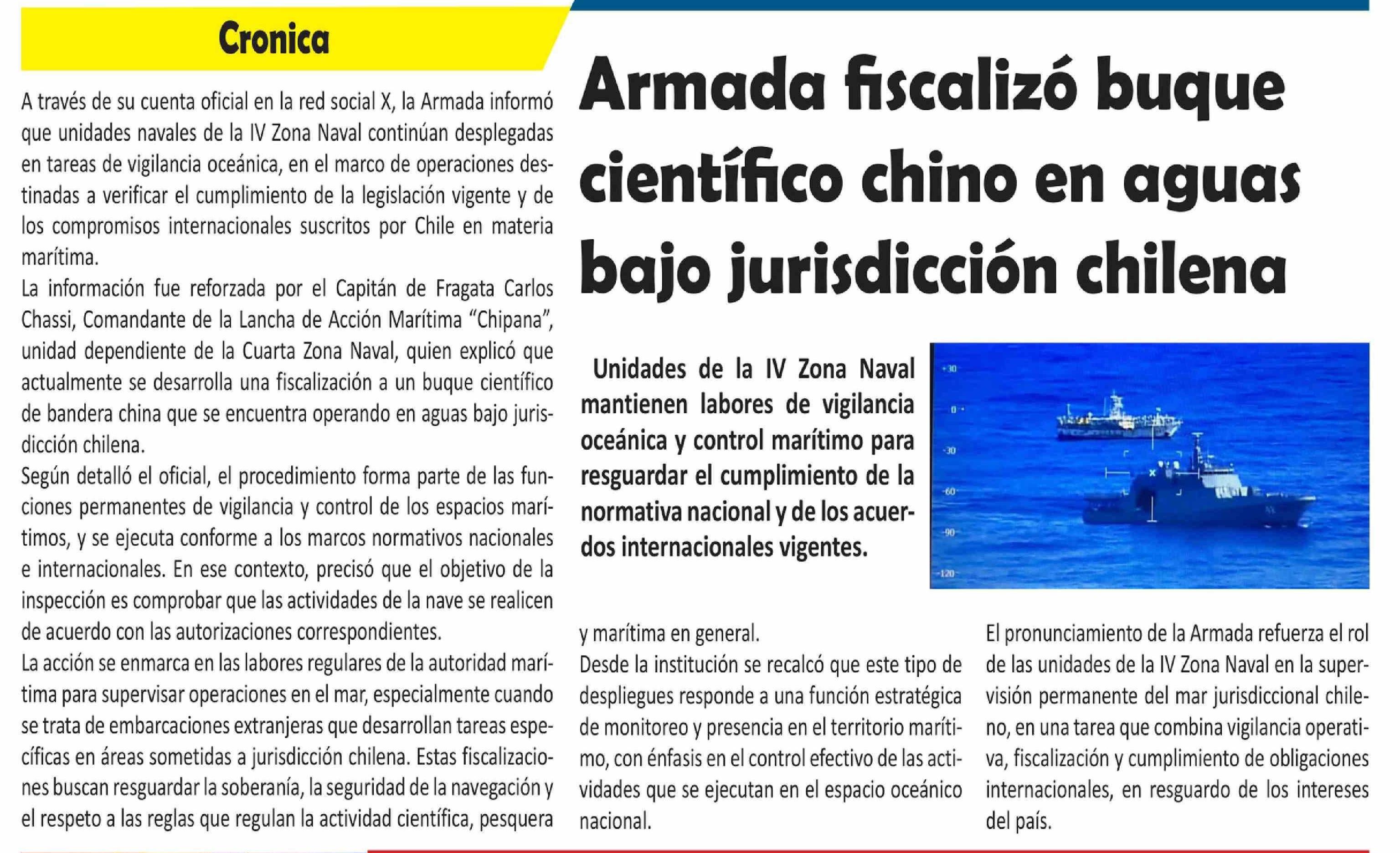 Armada fiscalizó buque científico chino en aguas bajo jurisdicción chilena 23-02-2026 El Longino |