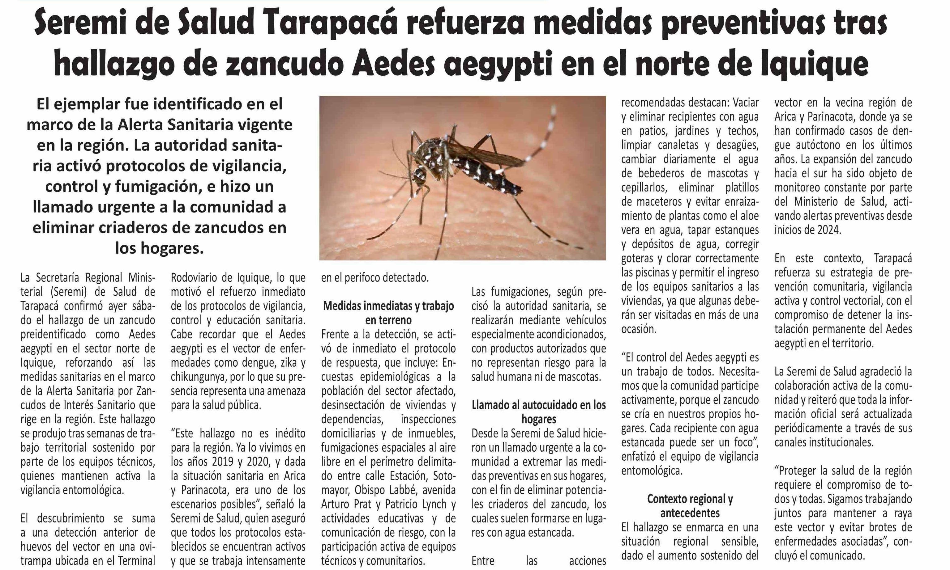 | Título: | Seremi de Salud Tarapacá refuerza medidas preventivas tras hallazgo de zancudo Aedes aegypti en el norte de Iquique |