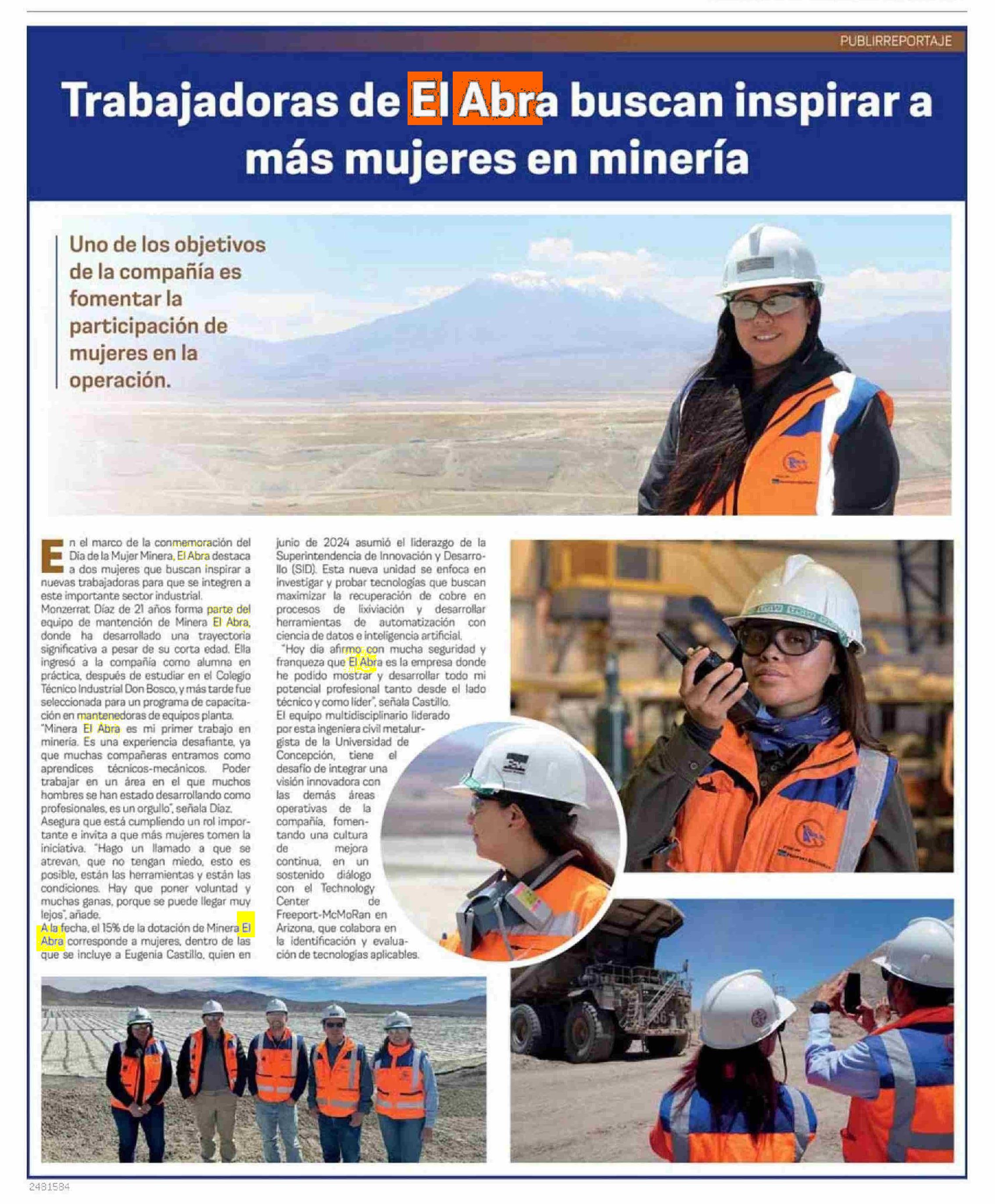 Trabajadoras de El Abra buscan inspirar a más mujeres en minería 13-06-2025 El Mercurio de Calama |