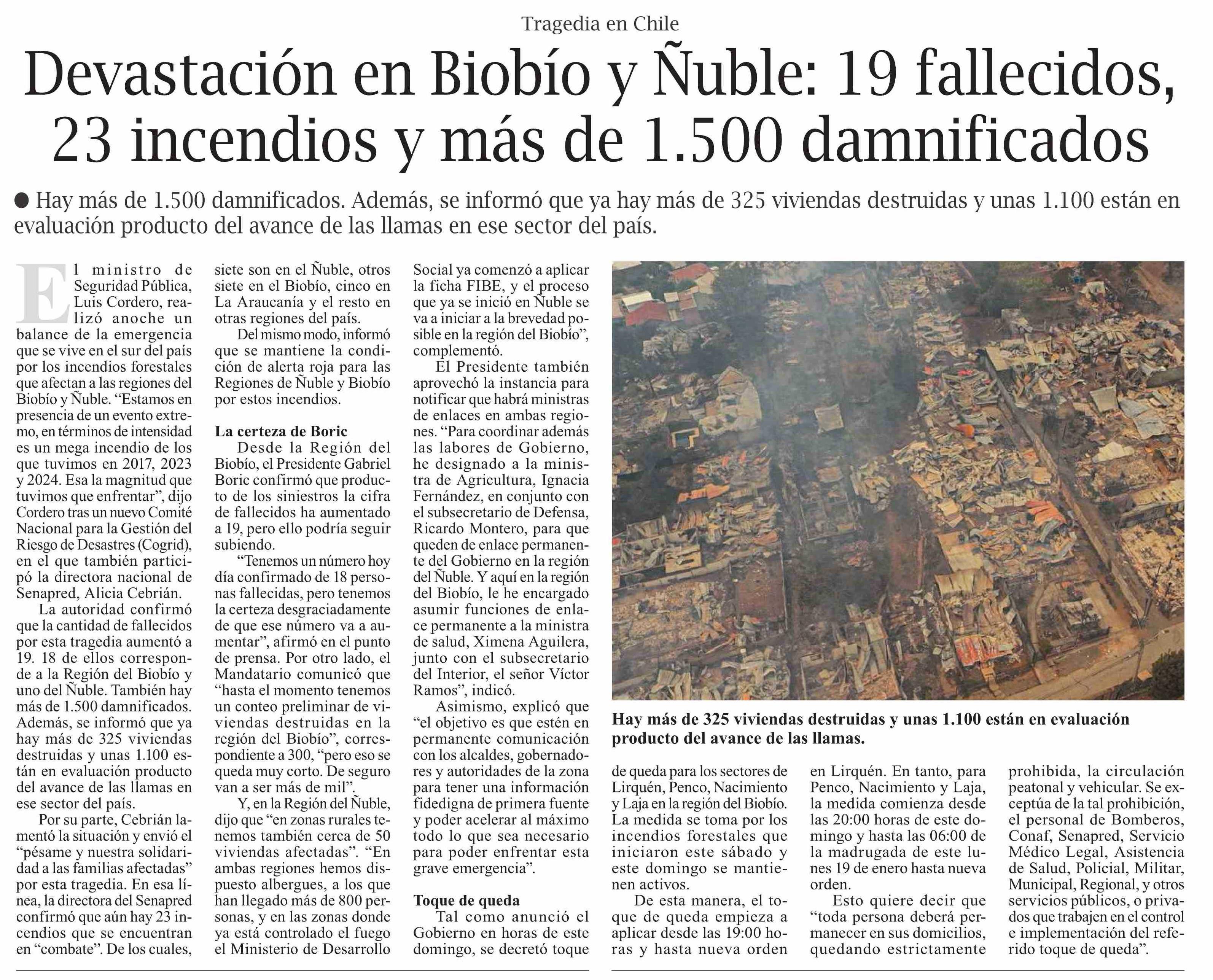 | Título: | Devastación en Biobío y Ñuble: 19 fallecidos, 23 incendios y más de 1.500 damnificados |