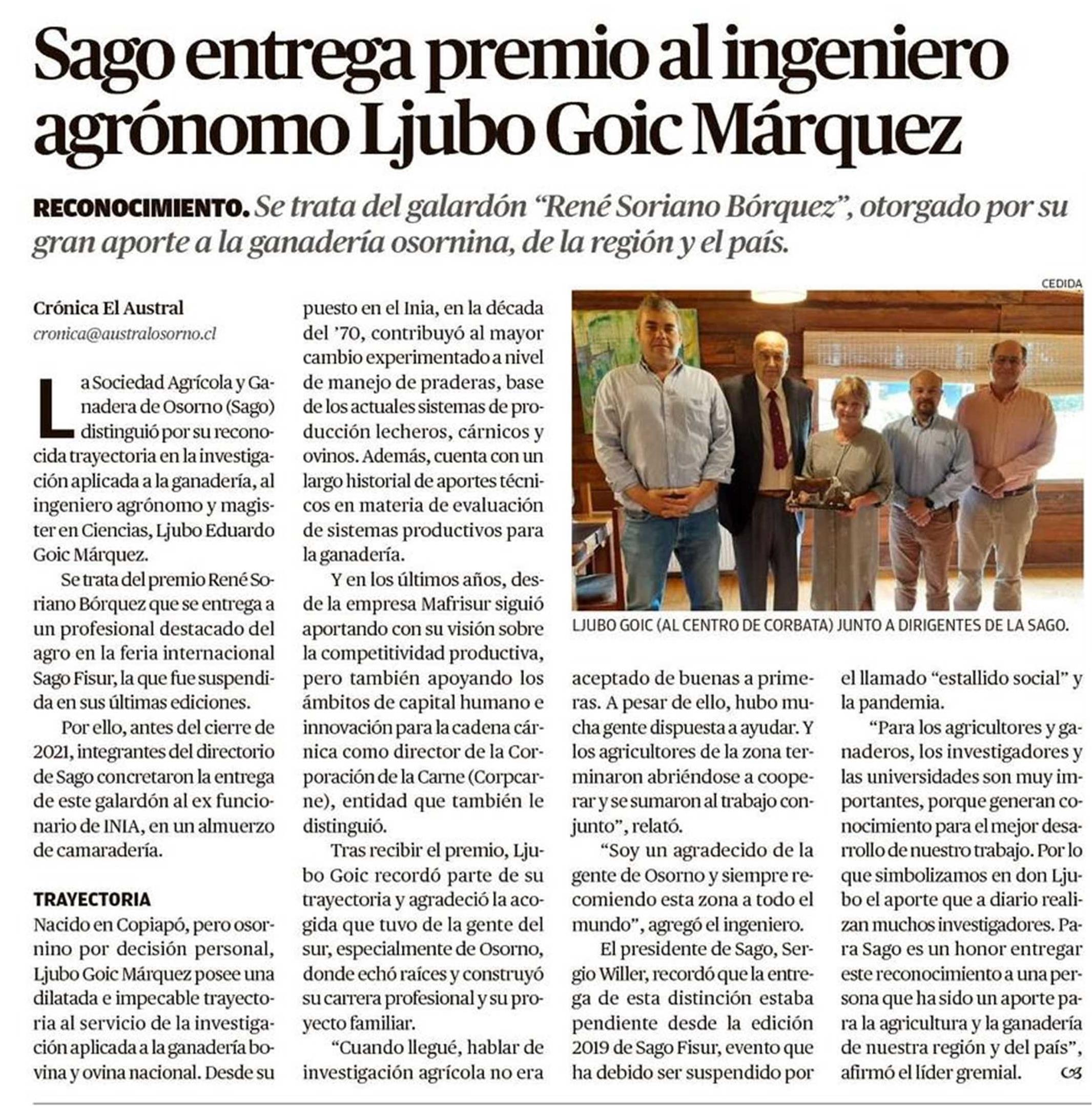 Sago entrega premio al ingeniero agrónomo Ljubo Goic Márquez 04-01-2022 El Austral de Osorno |