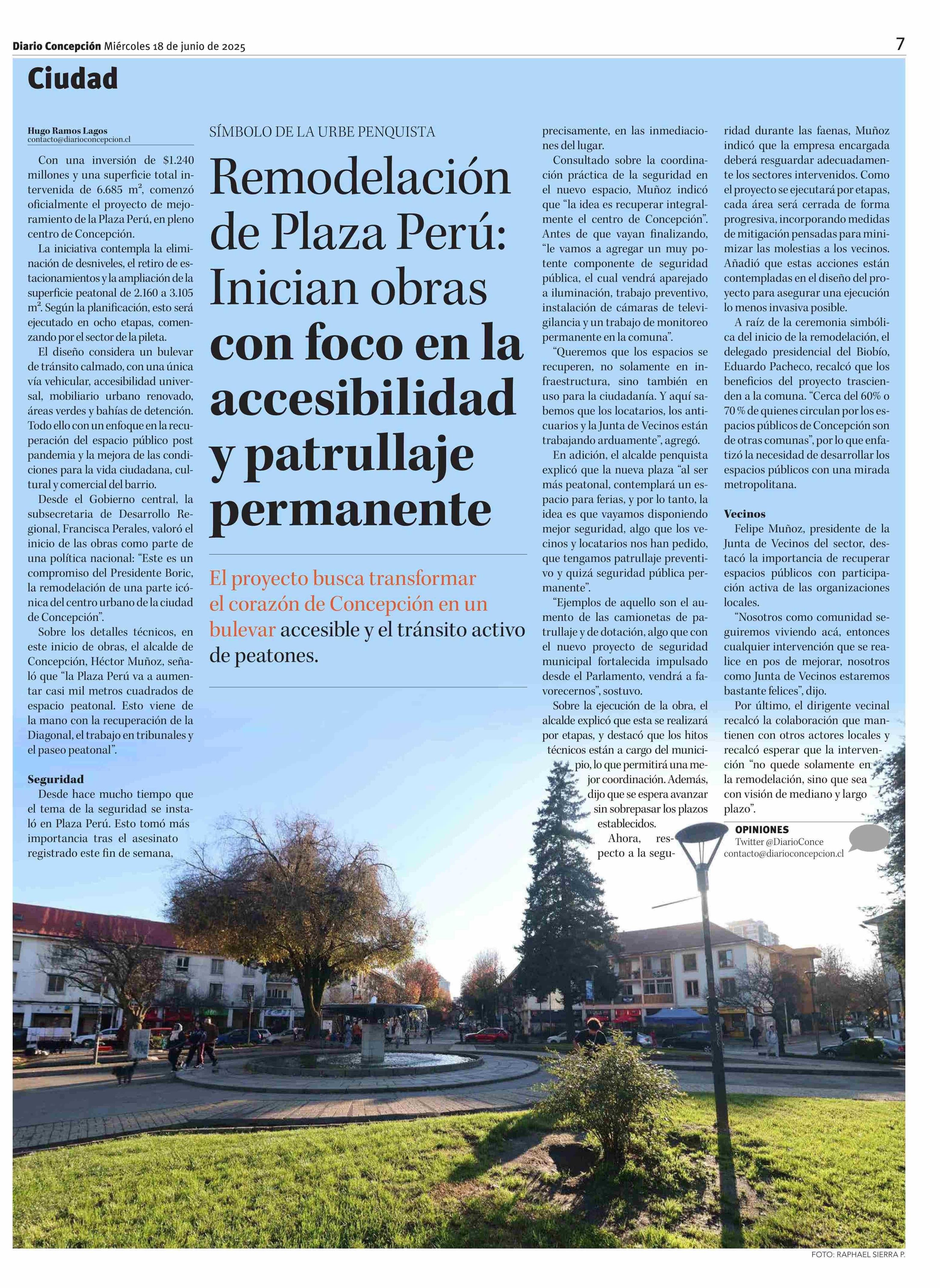 Remodelación de Plaza Perú: Inician obras con foco en la accesibilidad y patrullaje permanente 18-06-2025 Diario Concepción |