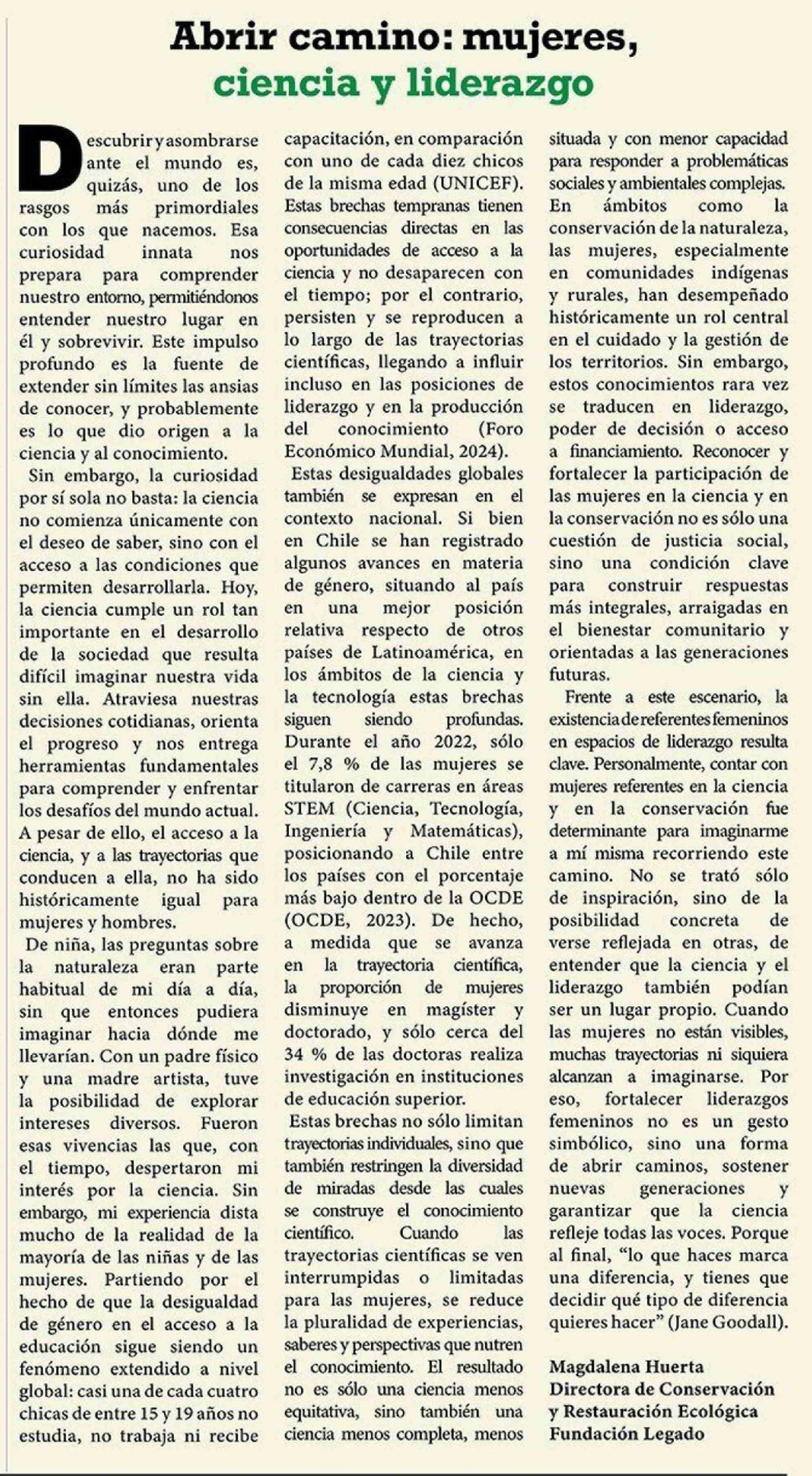 Columnas de Opinión: Abrir camino: mujeres, ciencia y liderazgo 12-02-2026 El Heraldo Austral |