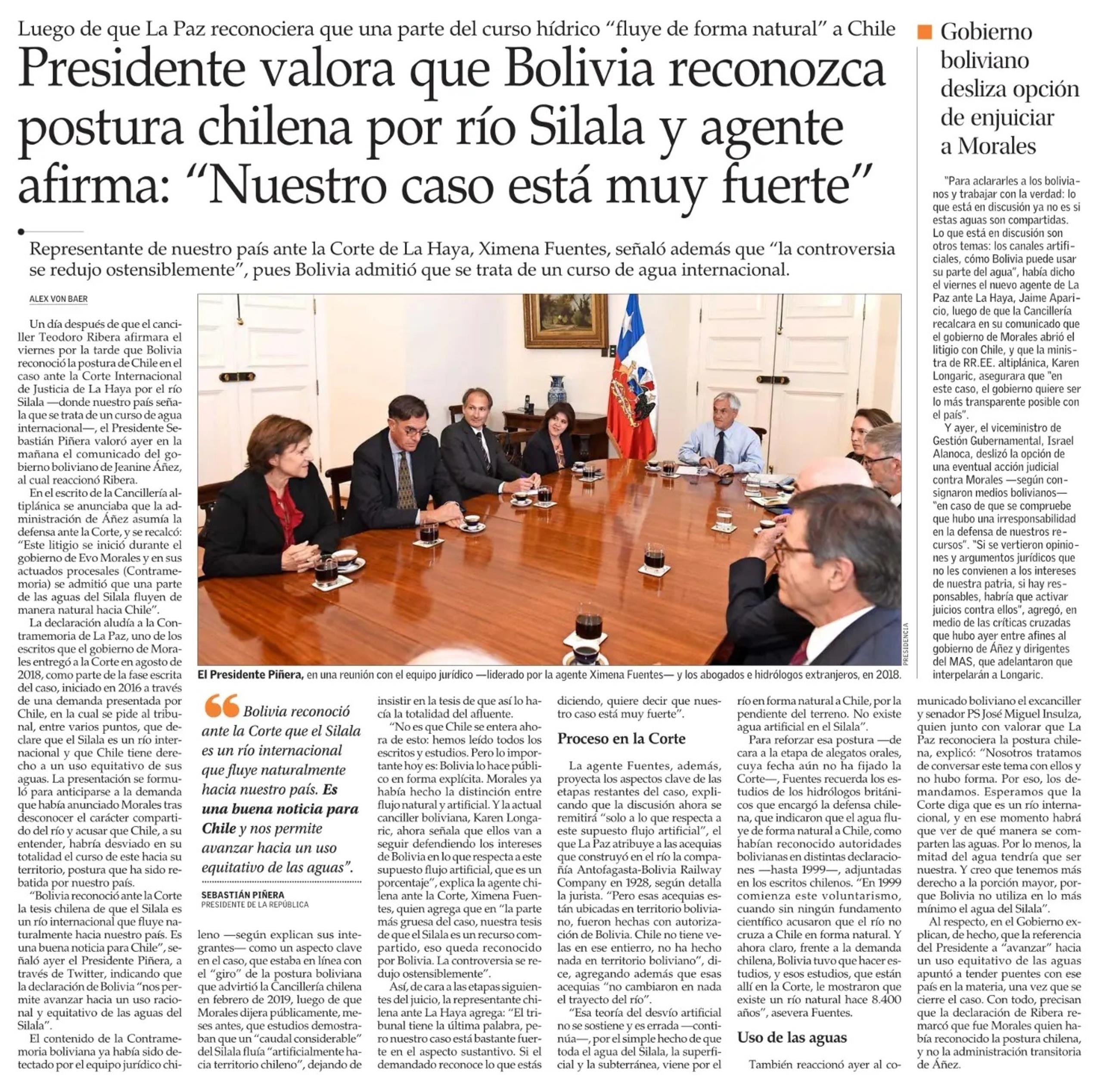 Presidente valora que Bolivia reconozca postura chilena por río Silala y agente afirma: “Nuestro caso está muy fuerte” 16-02-2020 El Mercurio |