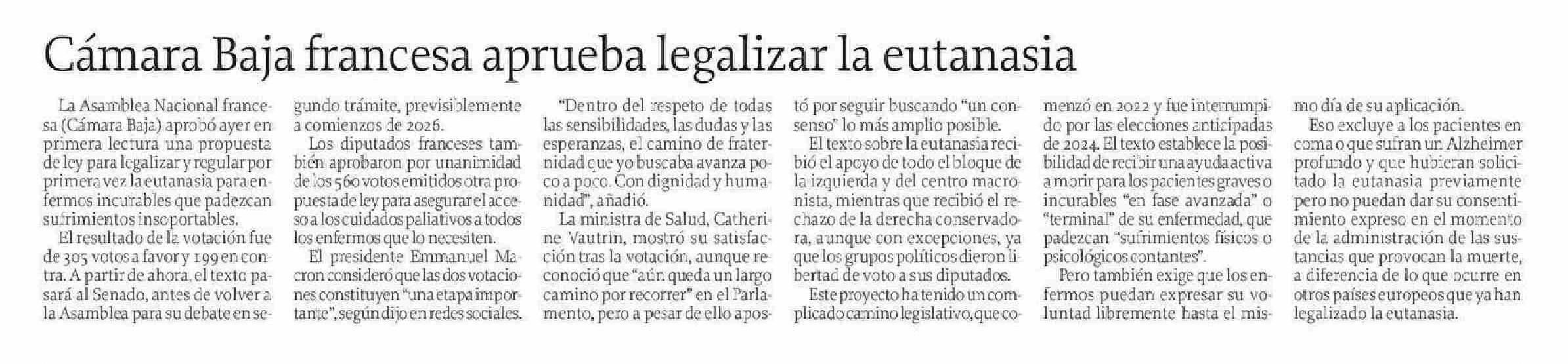 | Título: | Cámara Baja francesa aprueba legalizar la eutanasia |
