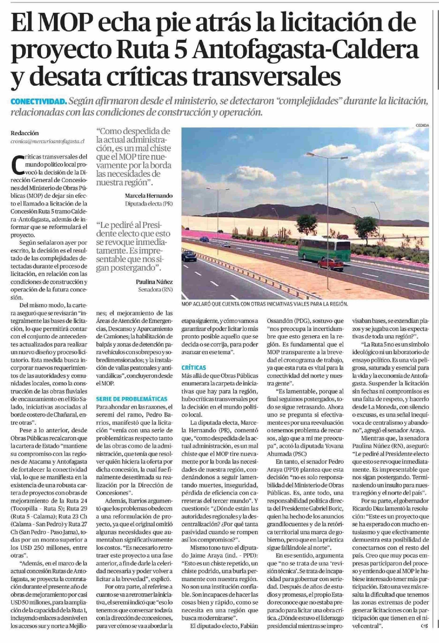 El MOP echa pie atrás la licitación de proyecto Ruta 5 Antofagasta-Caldera y desata críticas transversales 22-01-2026 El Mercurio de Calama |