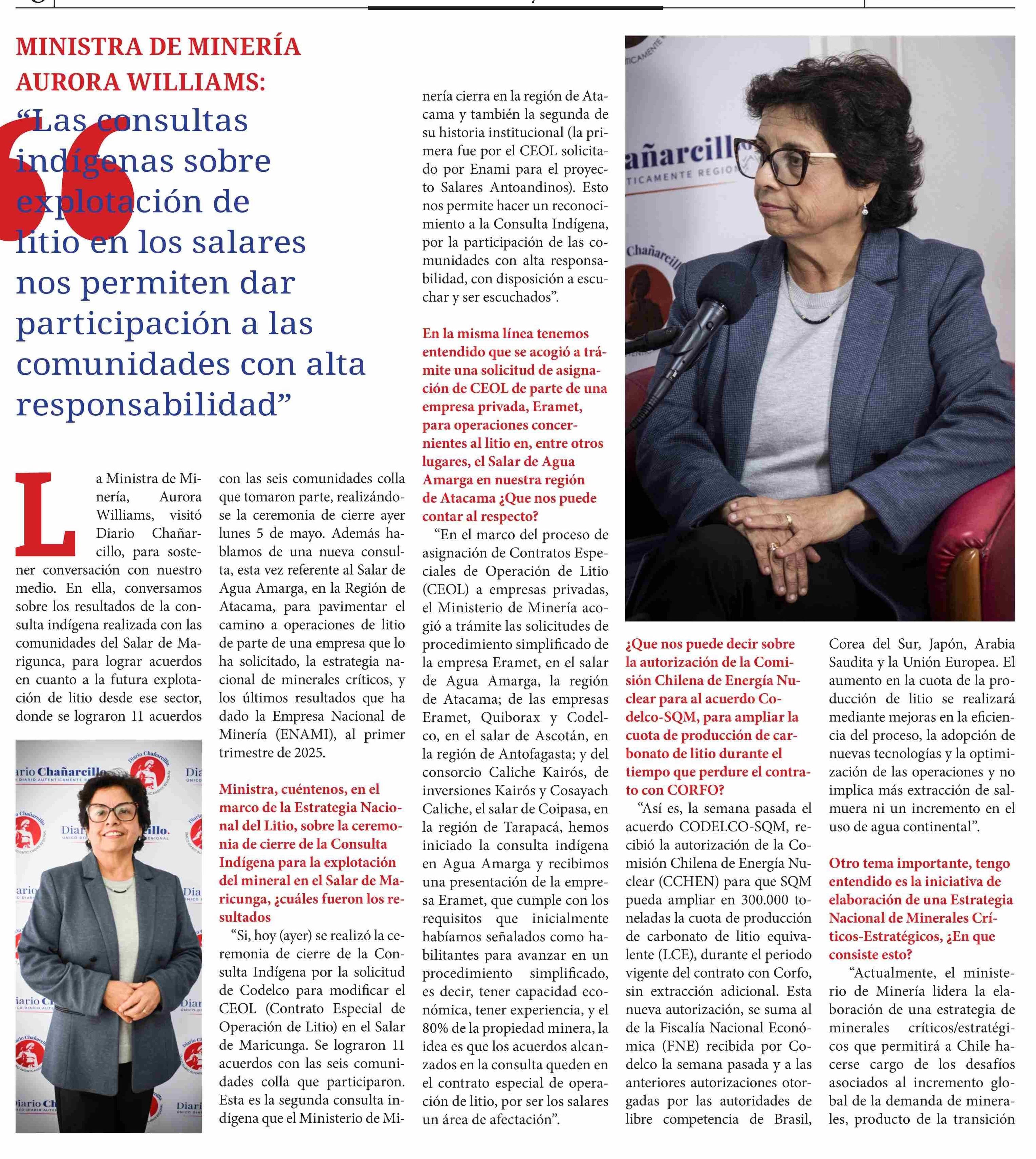 | Título: | La Ministra de Minería, Aurora Williams, visitó Diario Chañarcillo, para sostener conversación con nuestro medio. En ella, conversamos sobre los resultados de la consulta indígena realizada con las comunidades del Salar de Marigunca, para lograr acuerdos en cuanto a la futura explotación de litio de |