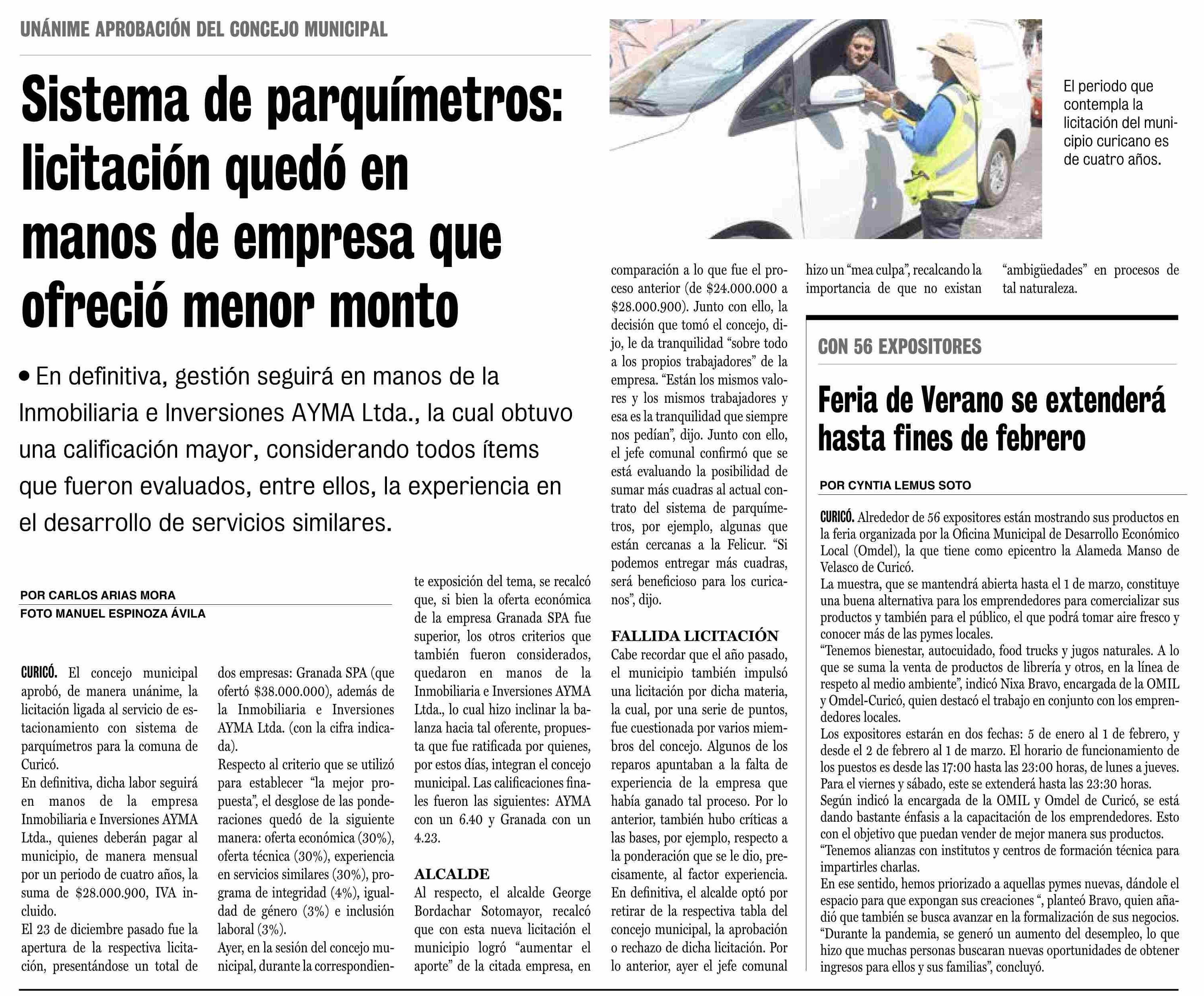Sistema de parquímetros: licitación quedó en manos de empresa que ofreció menor monto 15-01-2026 La Prensa de Curicó |