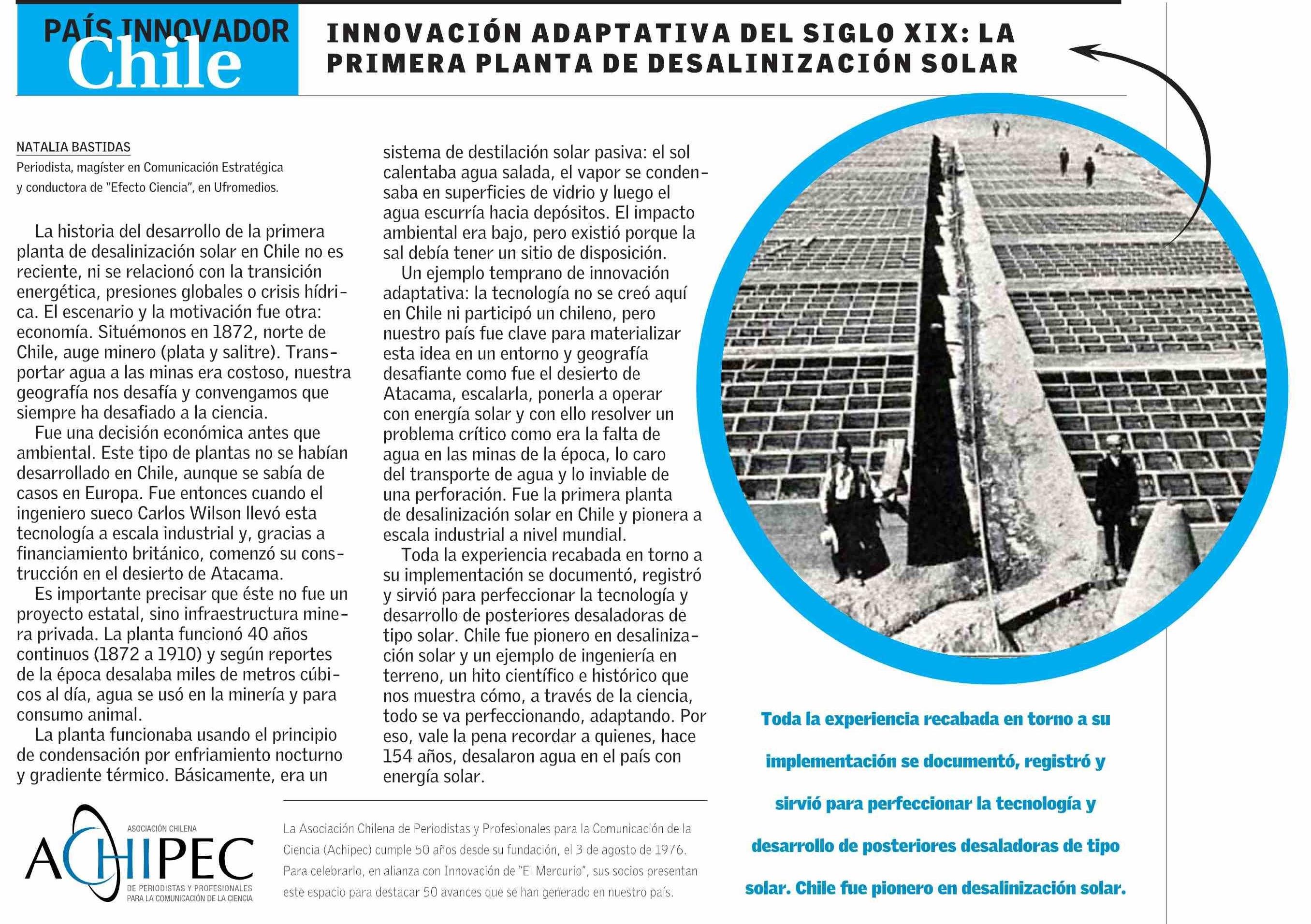INNOVACIÓN ADAPTATIVA DEL SIGLO XIX : LA PRIMERA PLANTA DE DESALINIZACIÓN SOLAR 26-03-2026 El Mercurio |