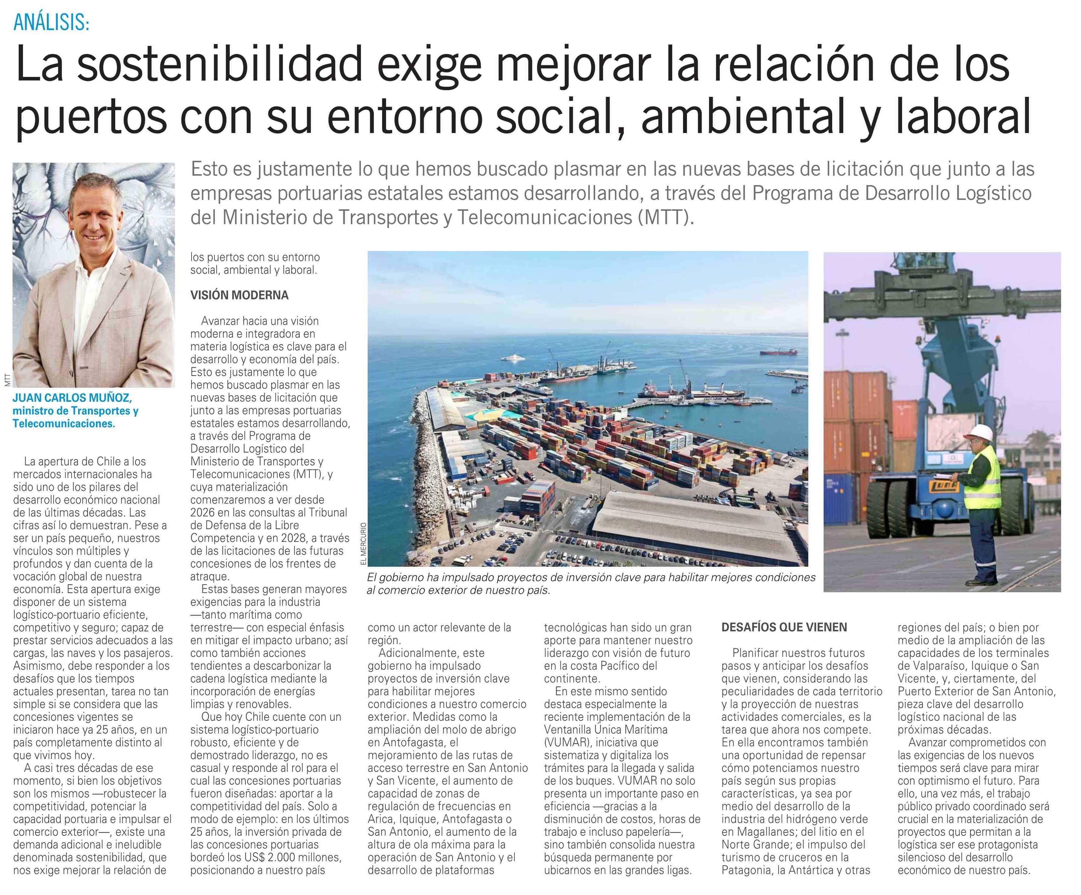 La sostenibilidad exige mejorar la relación de los puertos con su entorno social, ambiental y laboral 29-05-2025 El Mercurio |