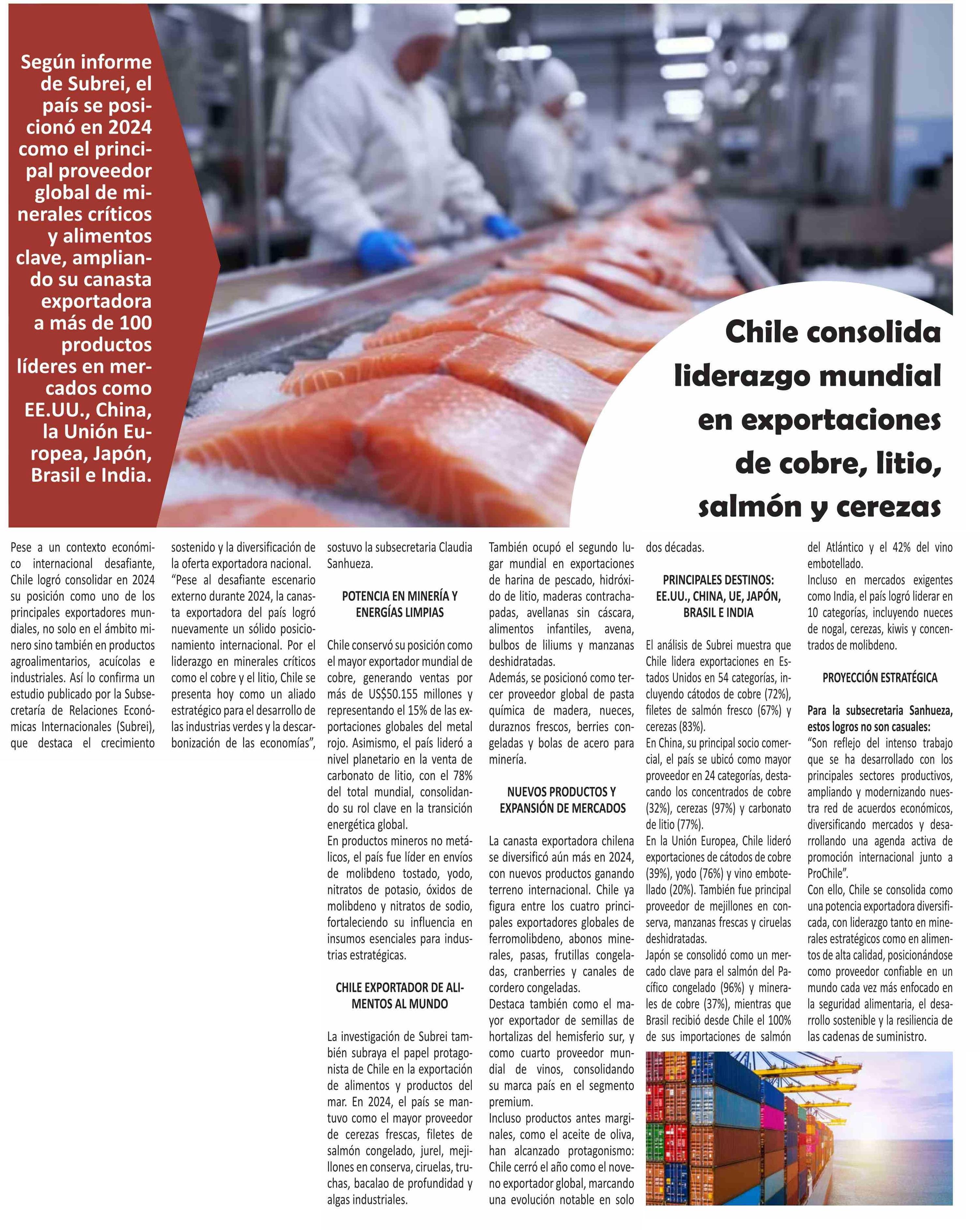 | Título: | Chile consolida liderazgo mundial en exportaciones de cobre, litio, salmón y cerezas |