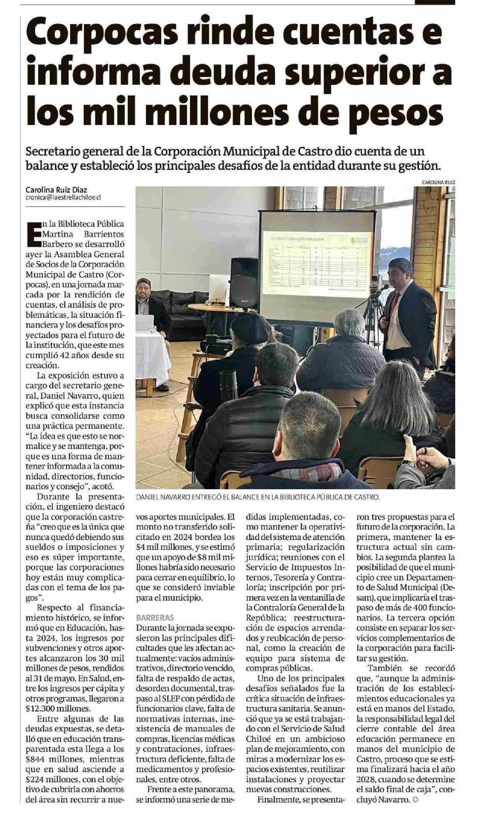 Corpocas rinde cuentas e informa deuda superior a los mil millones de pesos 10-06-2025 La Estrella de Chiloé |