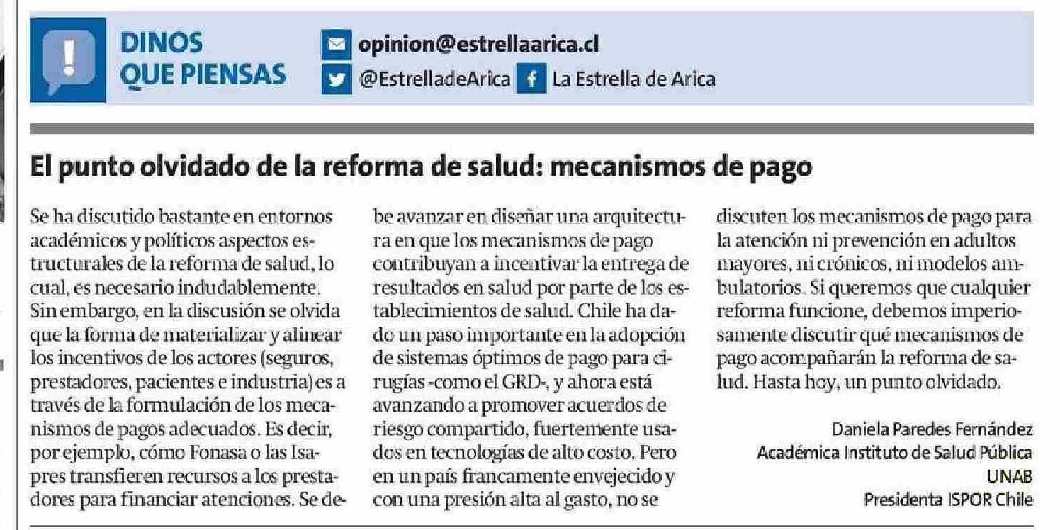 El punto olvidado de la reforma de salud: mecanismos de pago 10-06-2025 La Estrella de Arica |