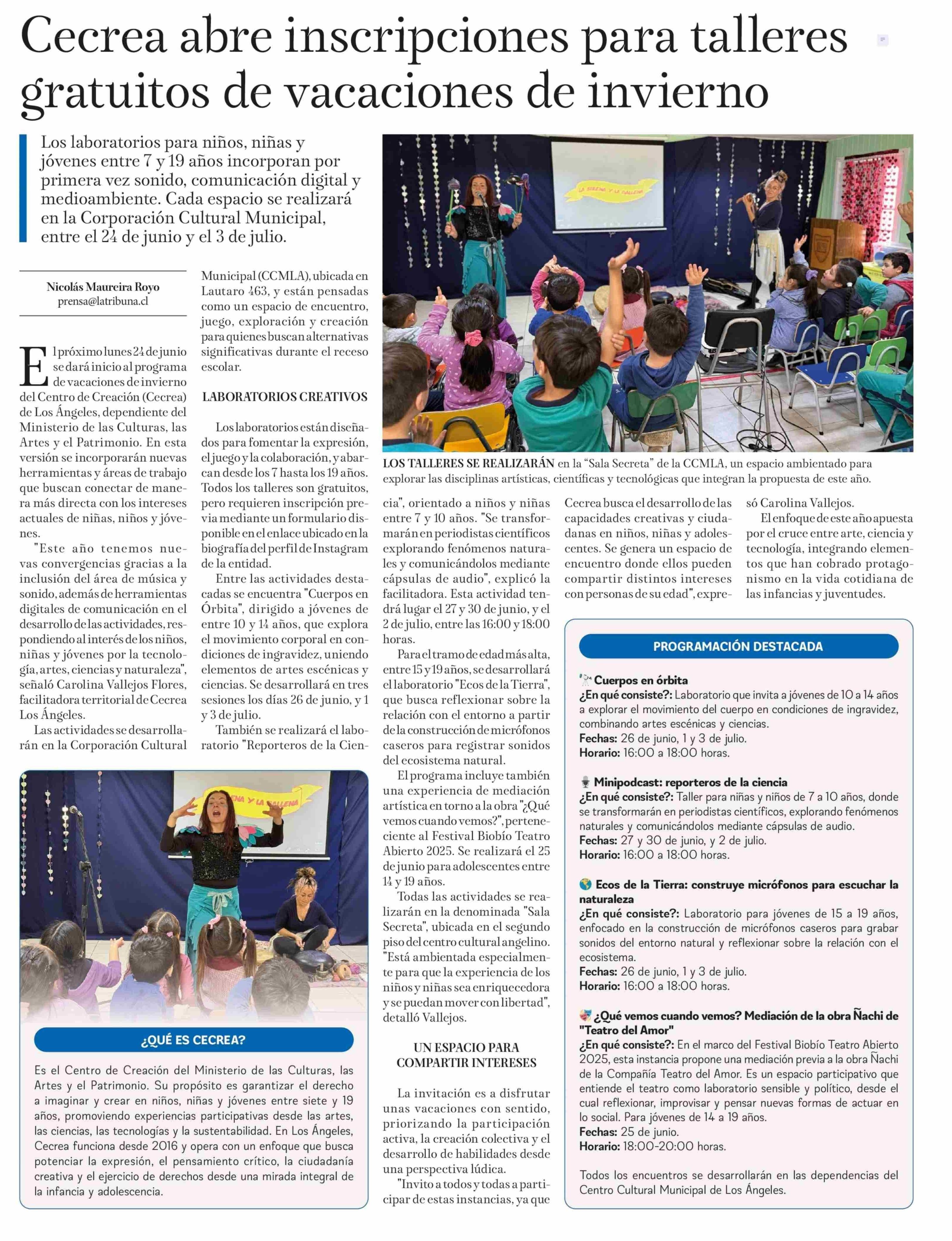 Cecrea abre inscripciones para talleres gratuitos de vacaciones de invierno 17-06-2025 La Tribuna |