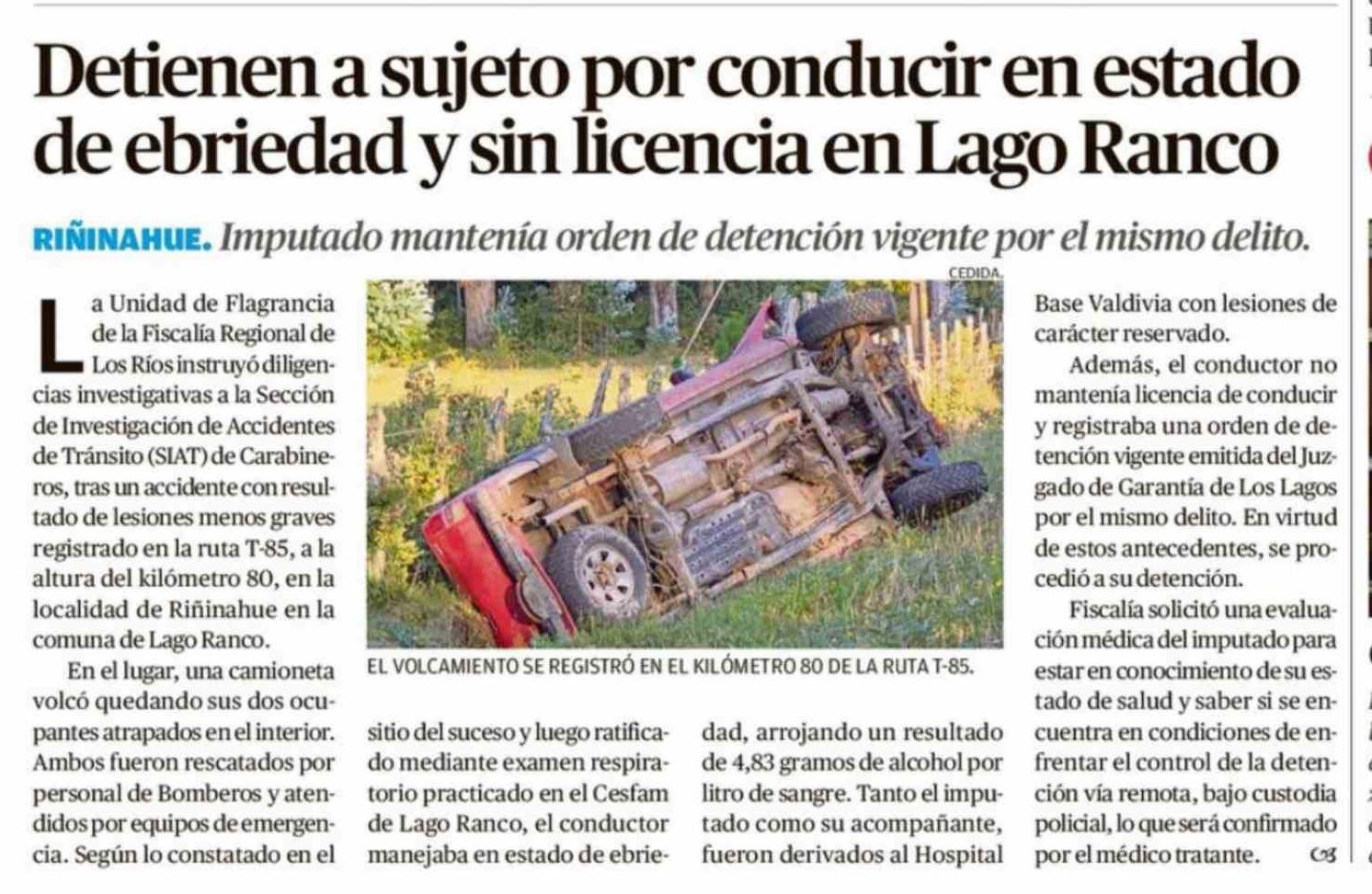 Detienen a sujeto por conducir en estado de ebriedad y sin licencia en Lago Ranco 22-02-2026 Diario Austral Región de Los Ríos |
