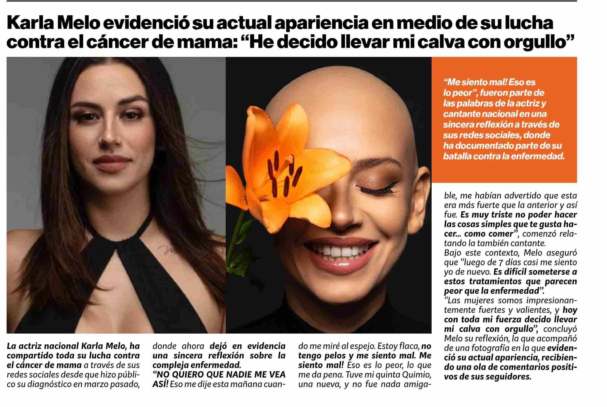 | Título: | Karla Melo evidenció su actual apariencia en medio de su lucha contra el cáncer de mama: “He decido llevar mi calva con orgullo” |
