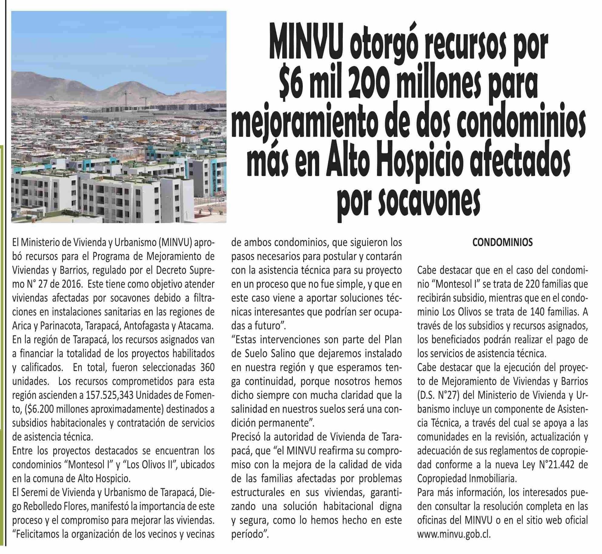 | Título: | MINVU otorgó recursos por $6 mil 200 millones para mejoramiento de dos condominios más en Alto Hospicio afectados por socavones |