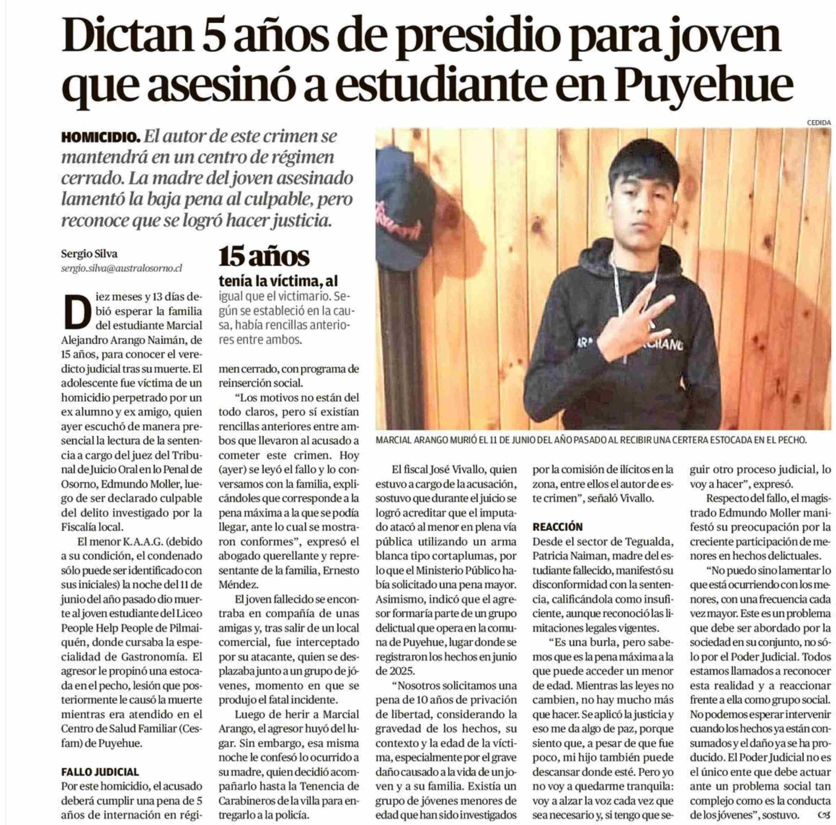 Título: Dictan 5 años de presidio para joven que asesinó a estudiante en Puyehue