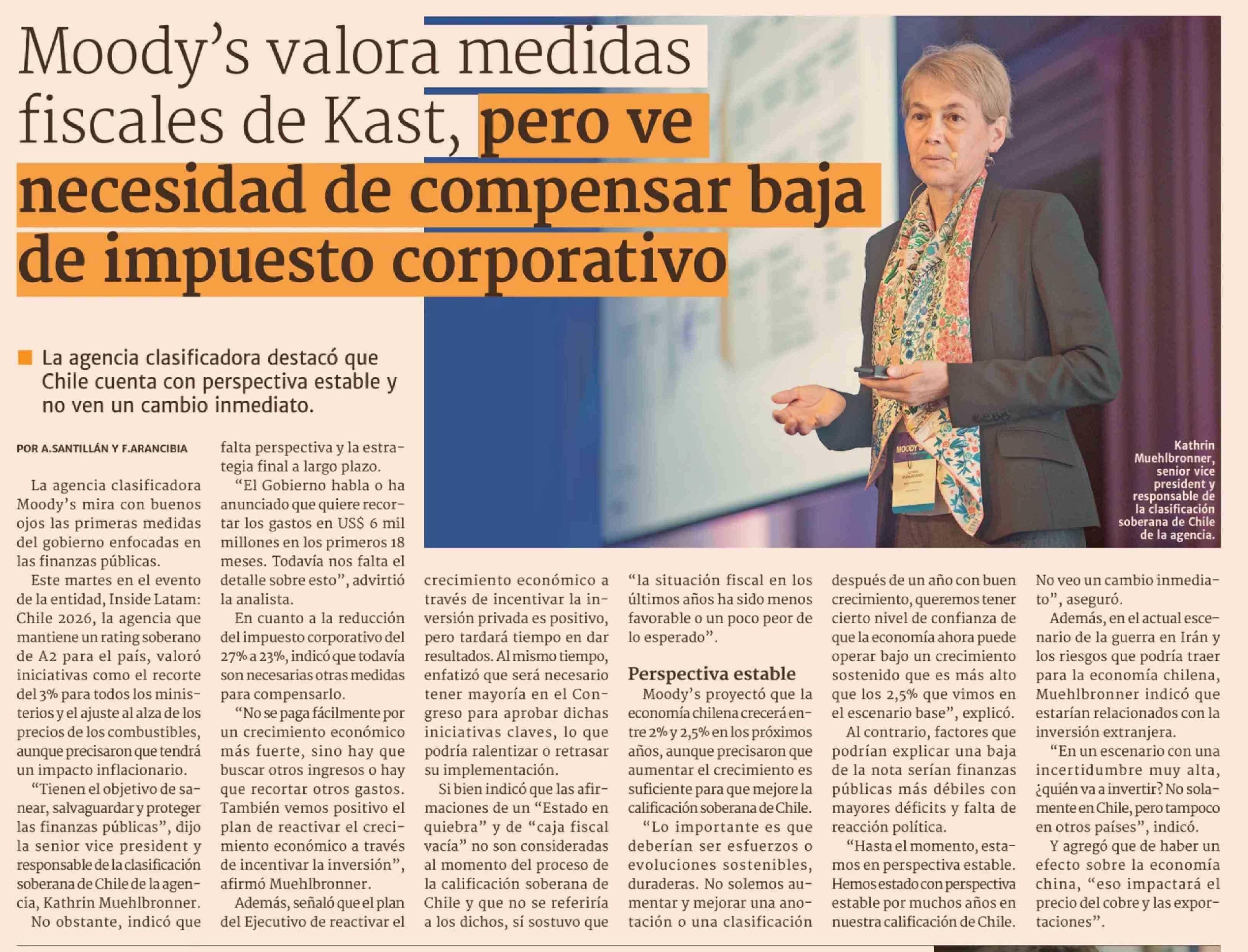 Título: Moody's valora medidas fiscales de Kast, pero ve necesidad de compensar baja de impuesto corporativo