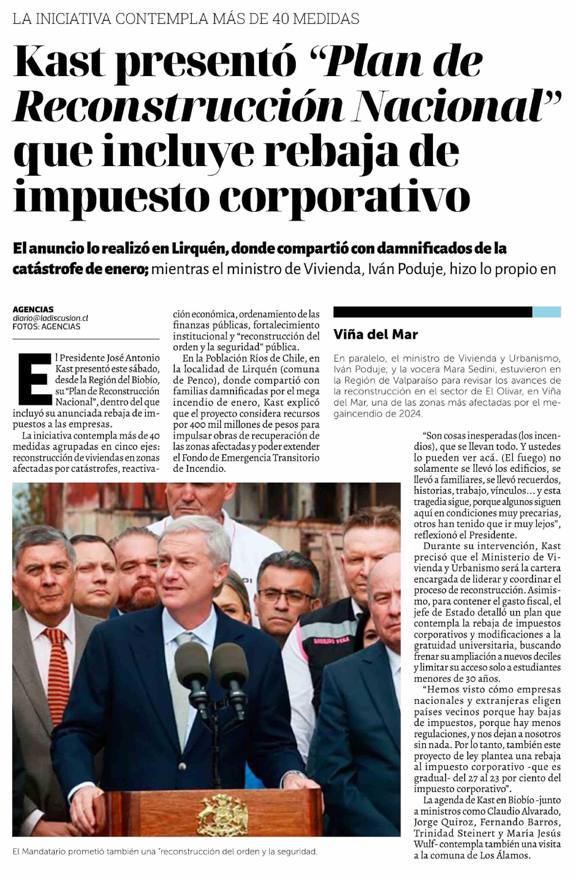 Kast presentó "Plan de Reconstrucción Nacional" que incluye rebaja de impuesto corporativo 15-03-2026 La Discusión |