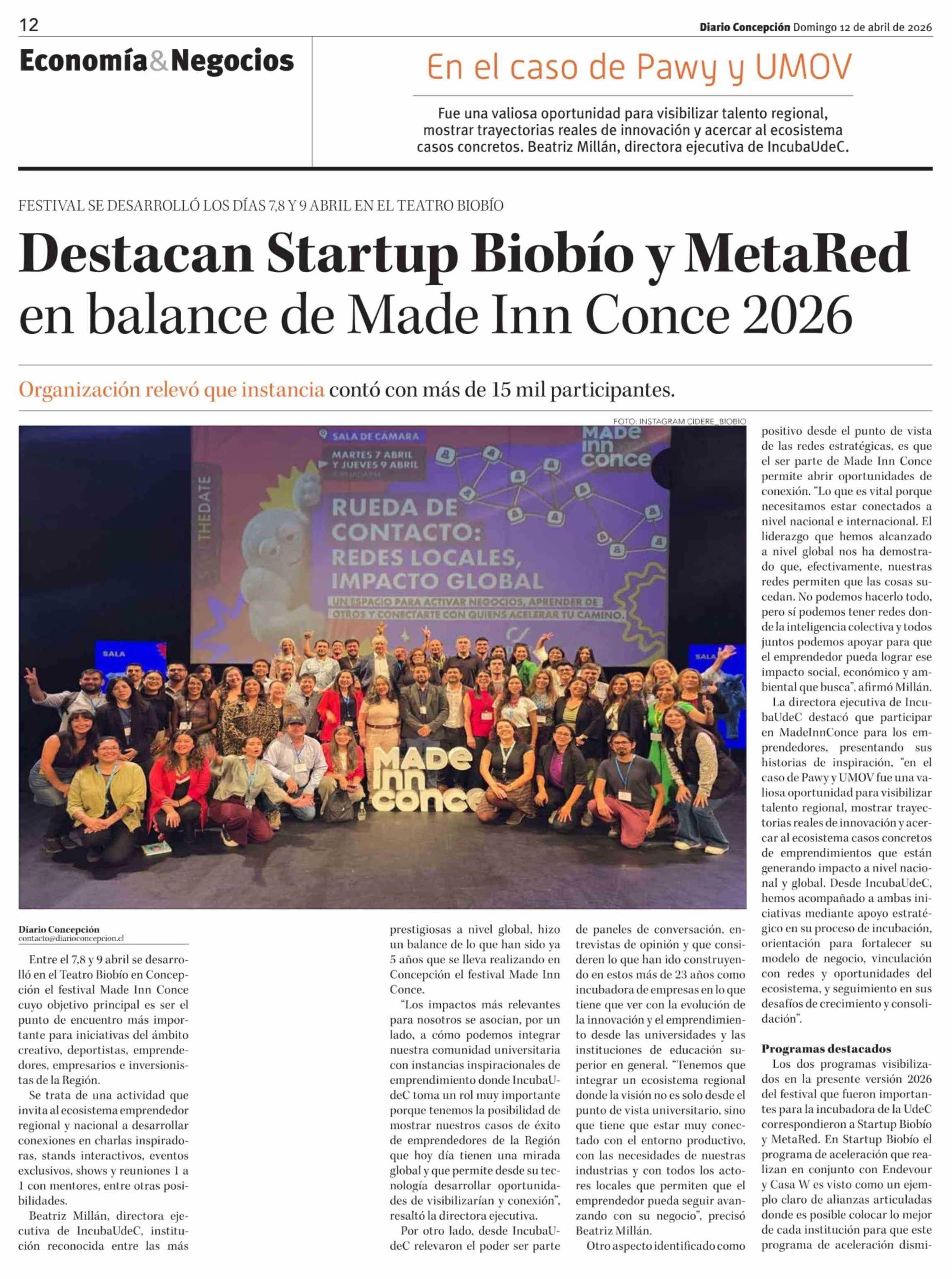 Destacan Startup Biobío y MetaRed en balance de Made Inn Conce 2026 12-04-2026 Diario Concepción |