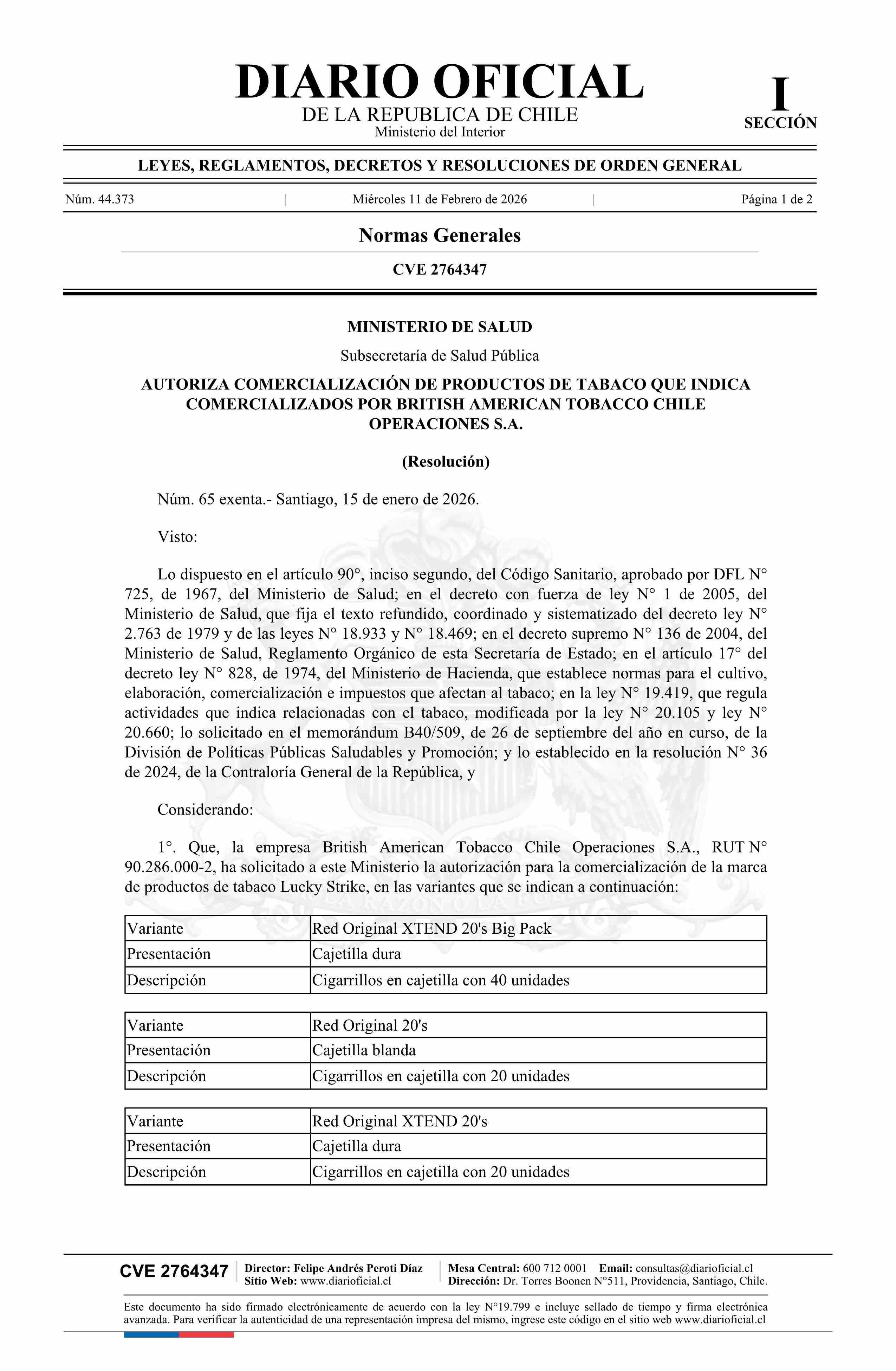 Resolución exenta número 65, de 2026.- Autoriza comercialización de productos de tabaco que indica comercializados por British American Tobacco Chile Operaciones S.A. 11-02-2026 Diario Oficial Edición Electrónica |