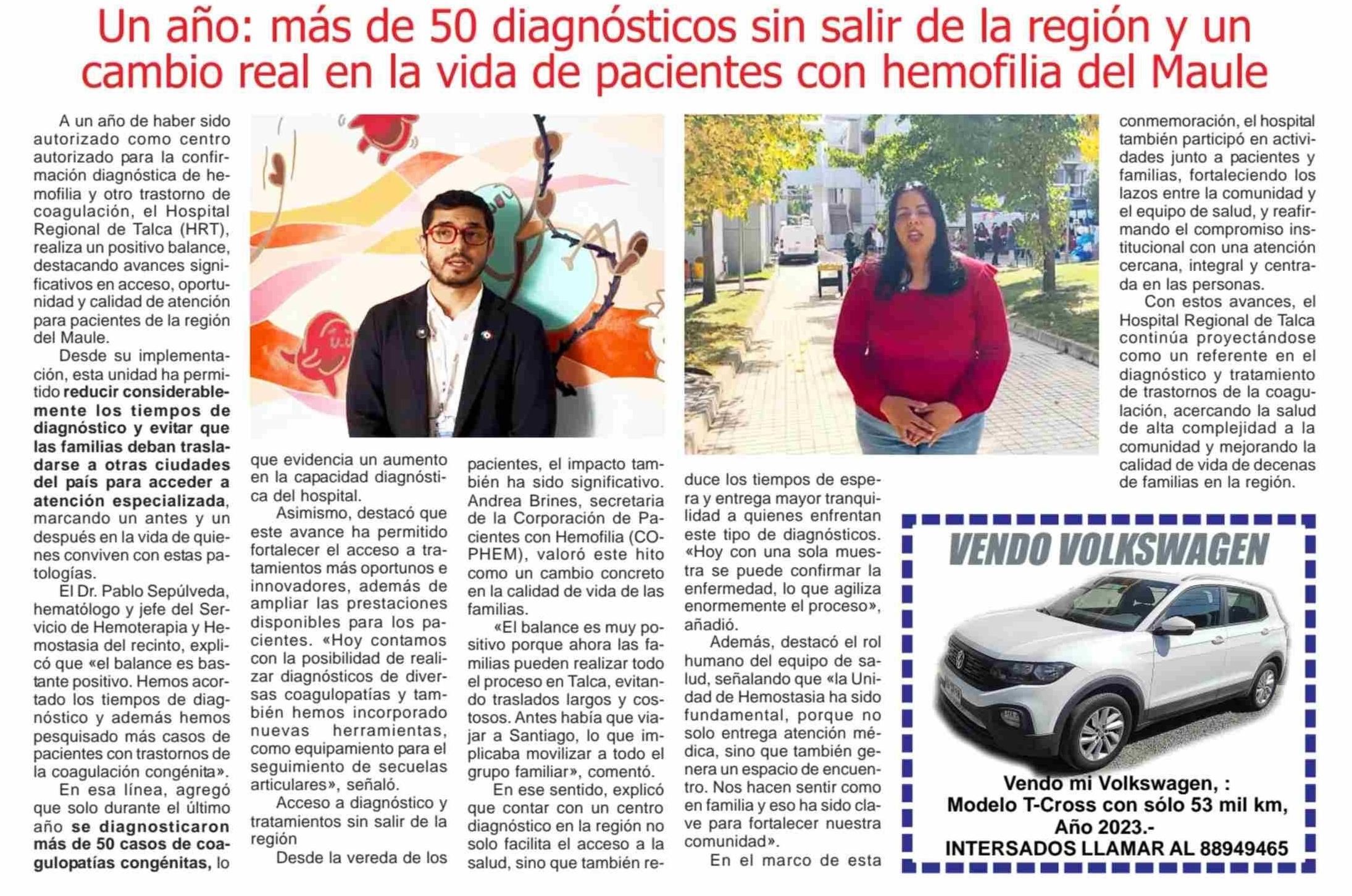 | Título: | Un año: más de 50 diagnósticos sin salir de la región y un cambio real en la vida de pacientes con hemofilia del Maule |