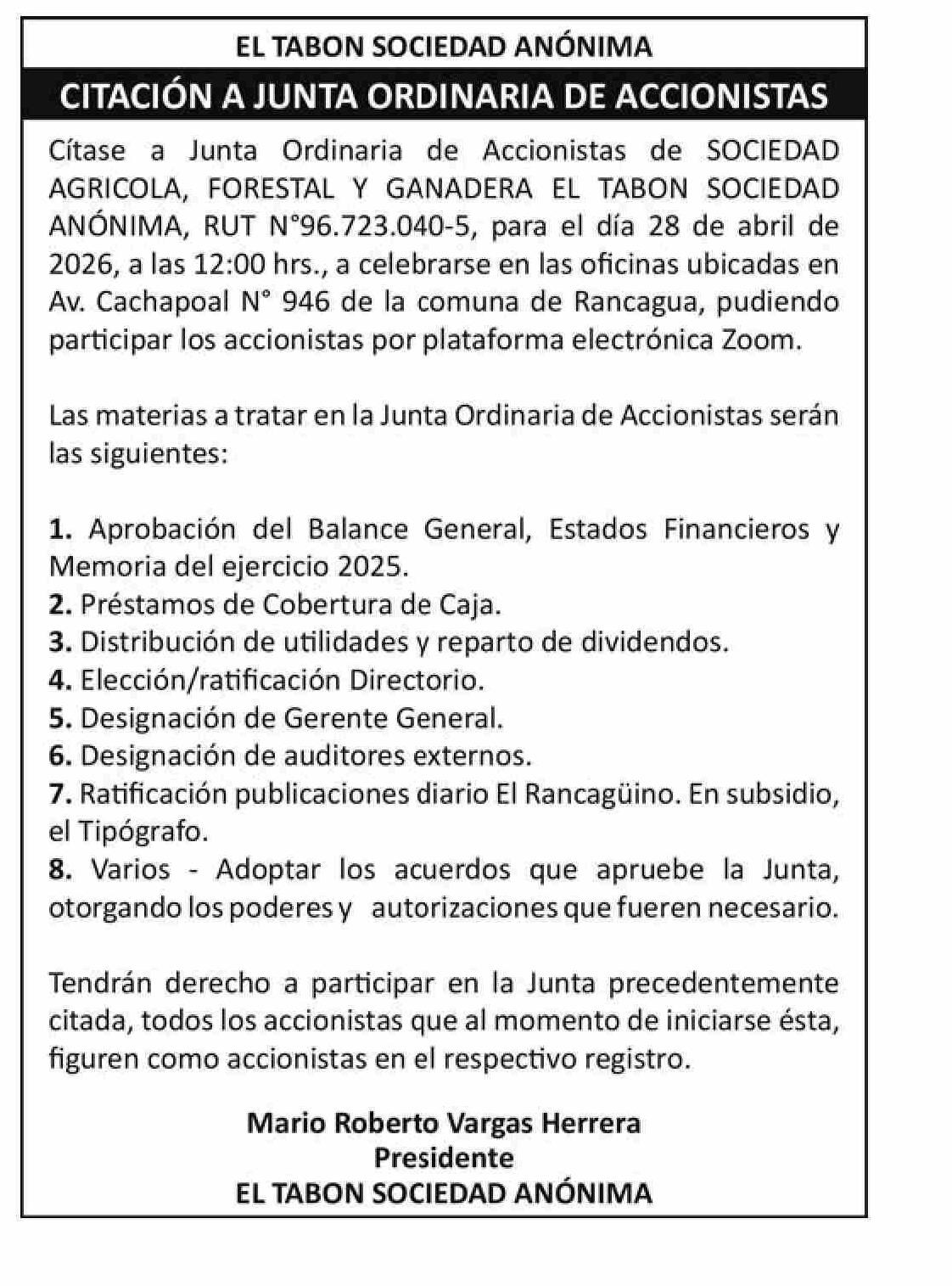 EXTRACTOS: EL TABON SOCIEDAD ANÓNIMA 14-04-2026 El Rancagüino |