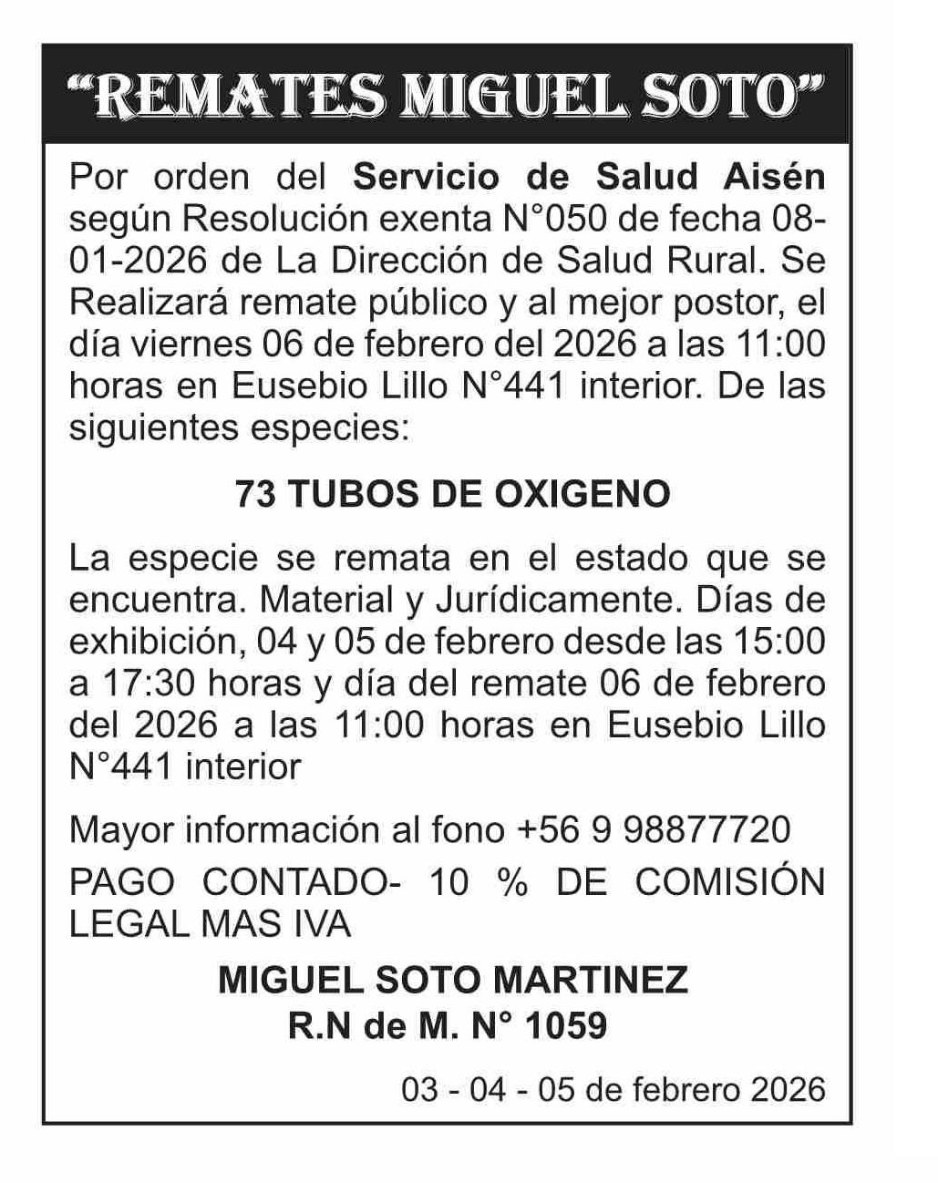 Fecha: 03-02-2026 Sector: Remates Región: Región Aysén del General Carlos Ibáñez del Campo