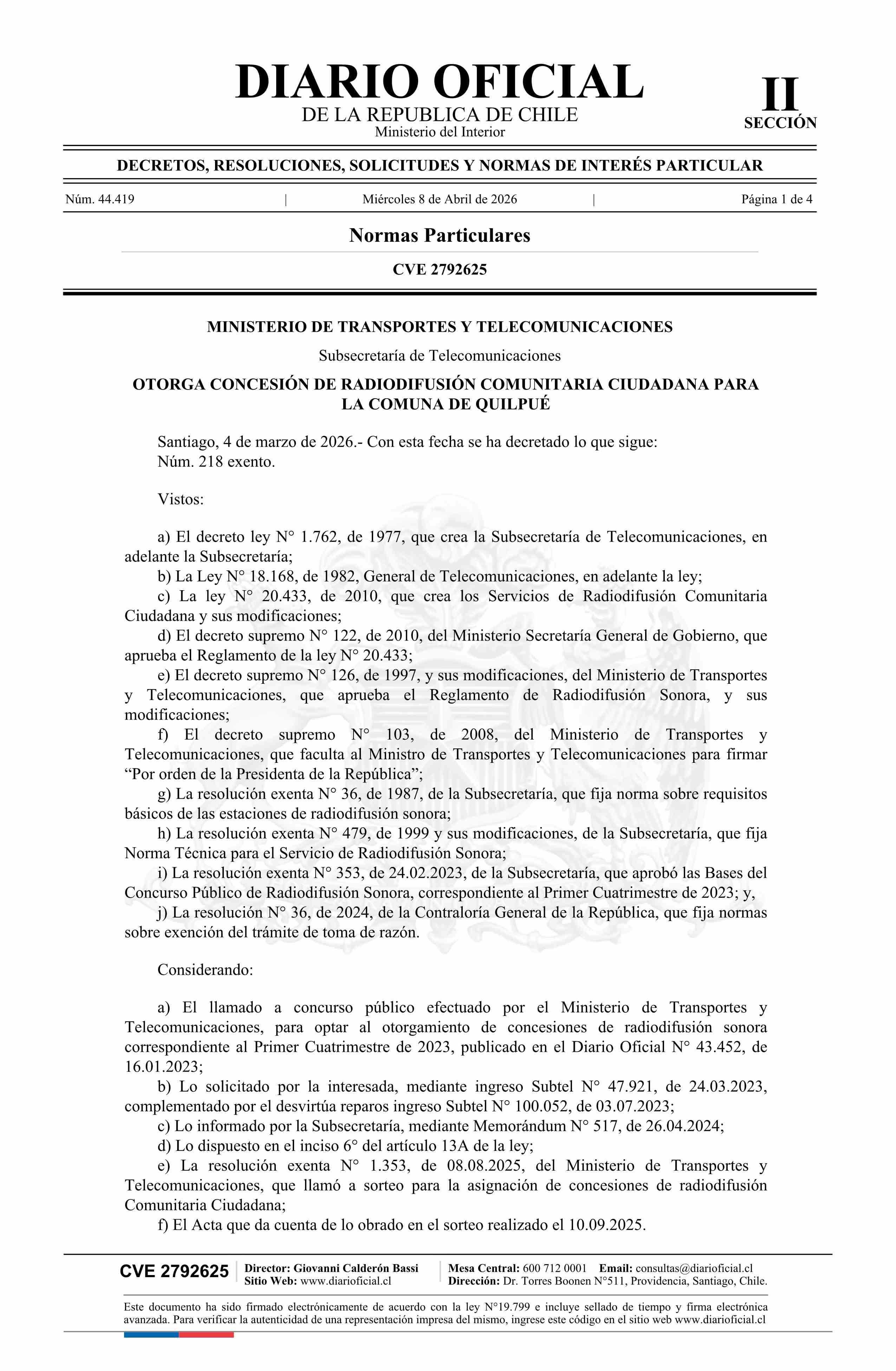 Decreto exento número 218, de 2026.- Otorga concesión de radiodifusión comunitaria ciudadana para la comuna de Quilpué 08-04-2026 Diario Oficial Edición Electrónica |