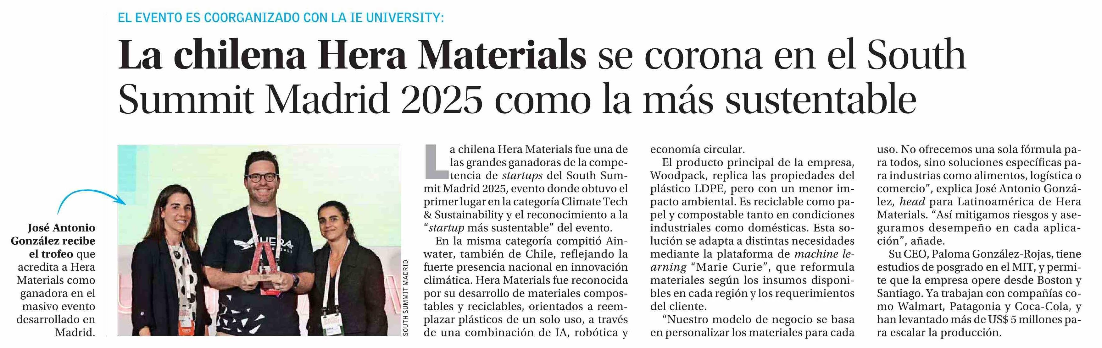 La chilena Hera Materials se corona en el South Summit Madrid 2025 como la más sustentable 12-06-2025 El Mercurio |