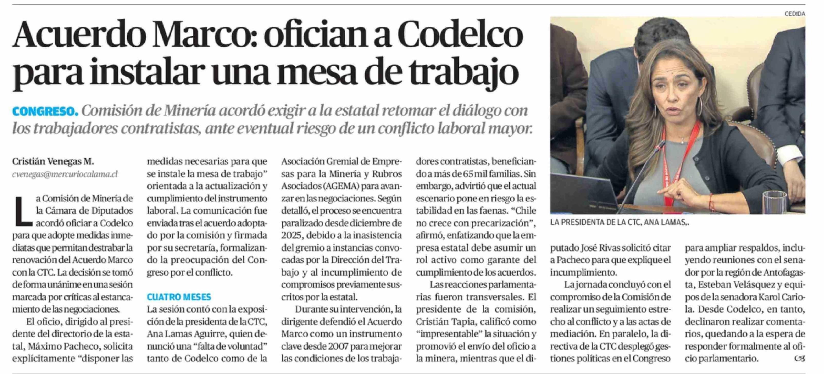 Acuerdo Marco: ofician a Codelco para instalar una mesa de trabajo