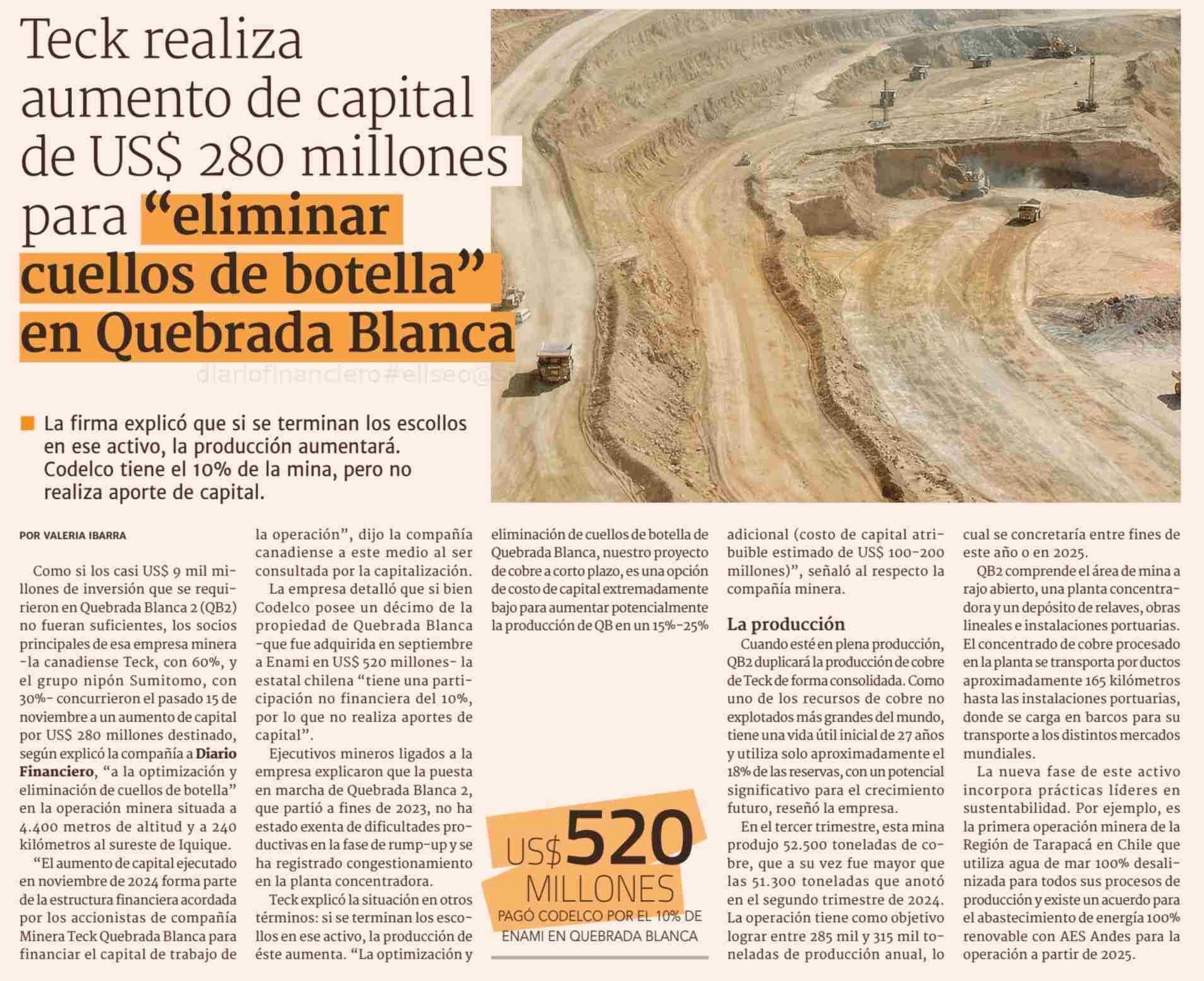 Teck realiza aumento de capital de US$ 280 millones para ´´eliminar cuellos de botella'' en Quebrada Blanca 29-11-2024 Diario Financiero |
