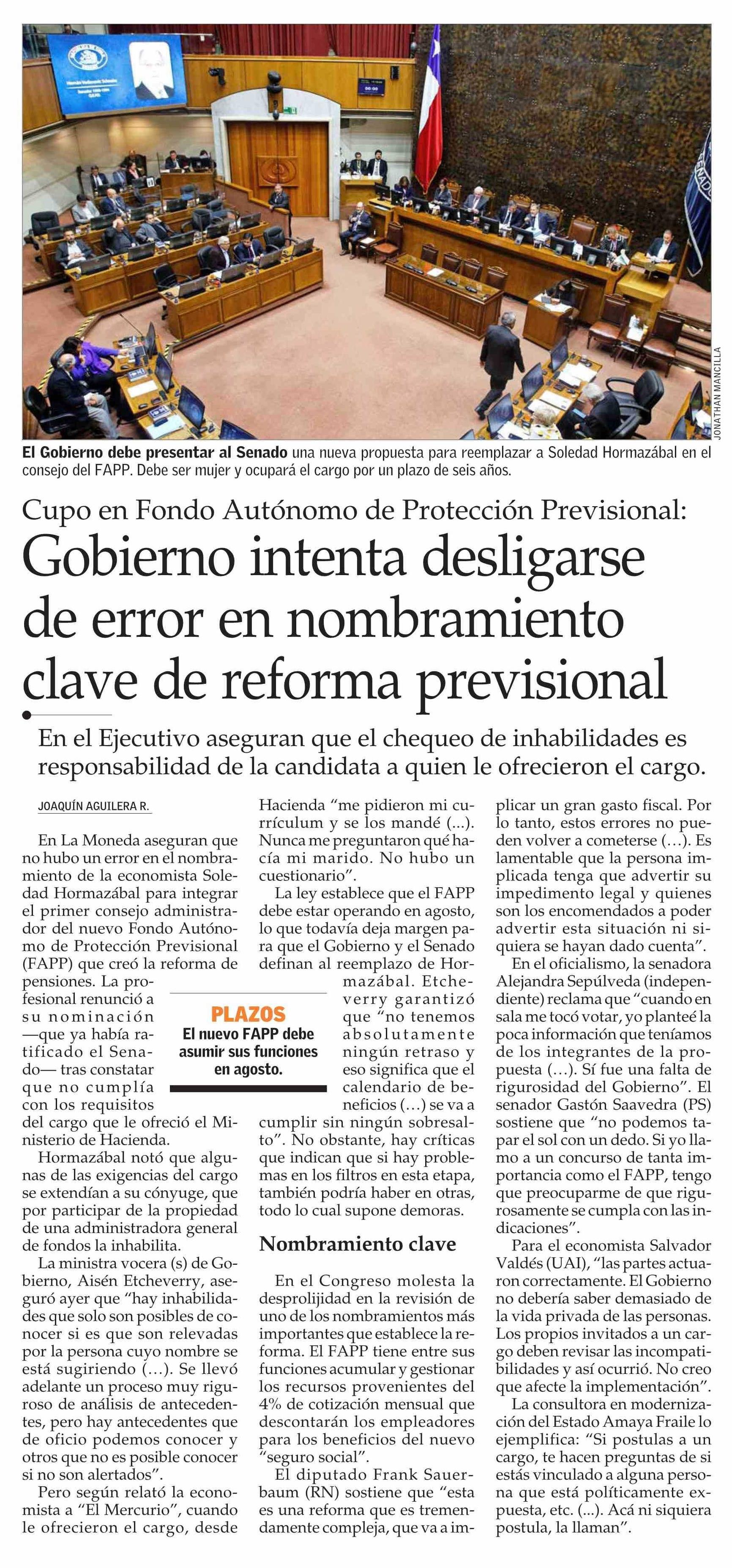 Gobierno intenta desligarse de error en nombramiento clave de reforma previsional 10-06-2025 El Mercurio |