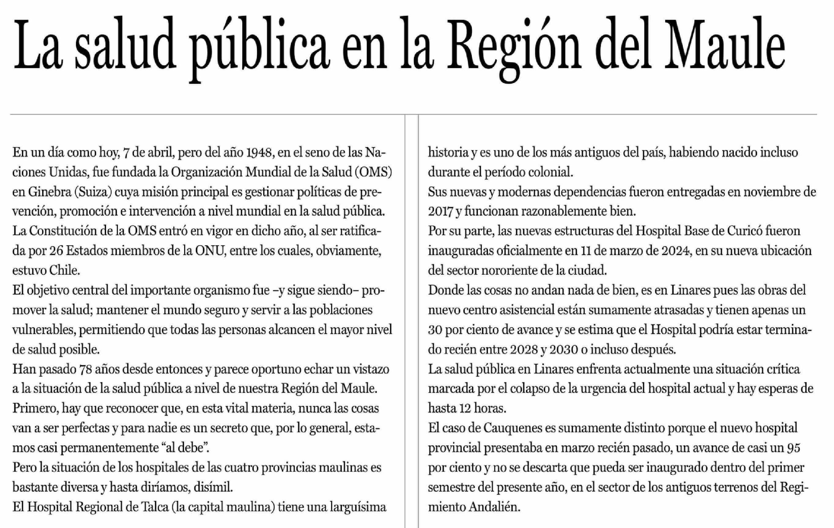 Editorial: La salud pública en la Región del Maule 07-04-2026 La Prensa de Curicó |