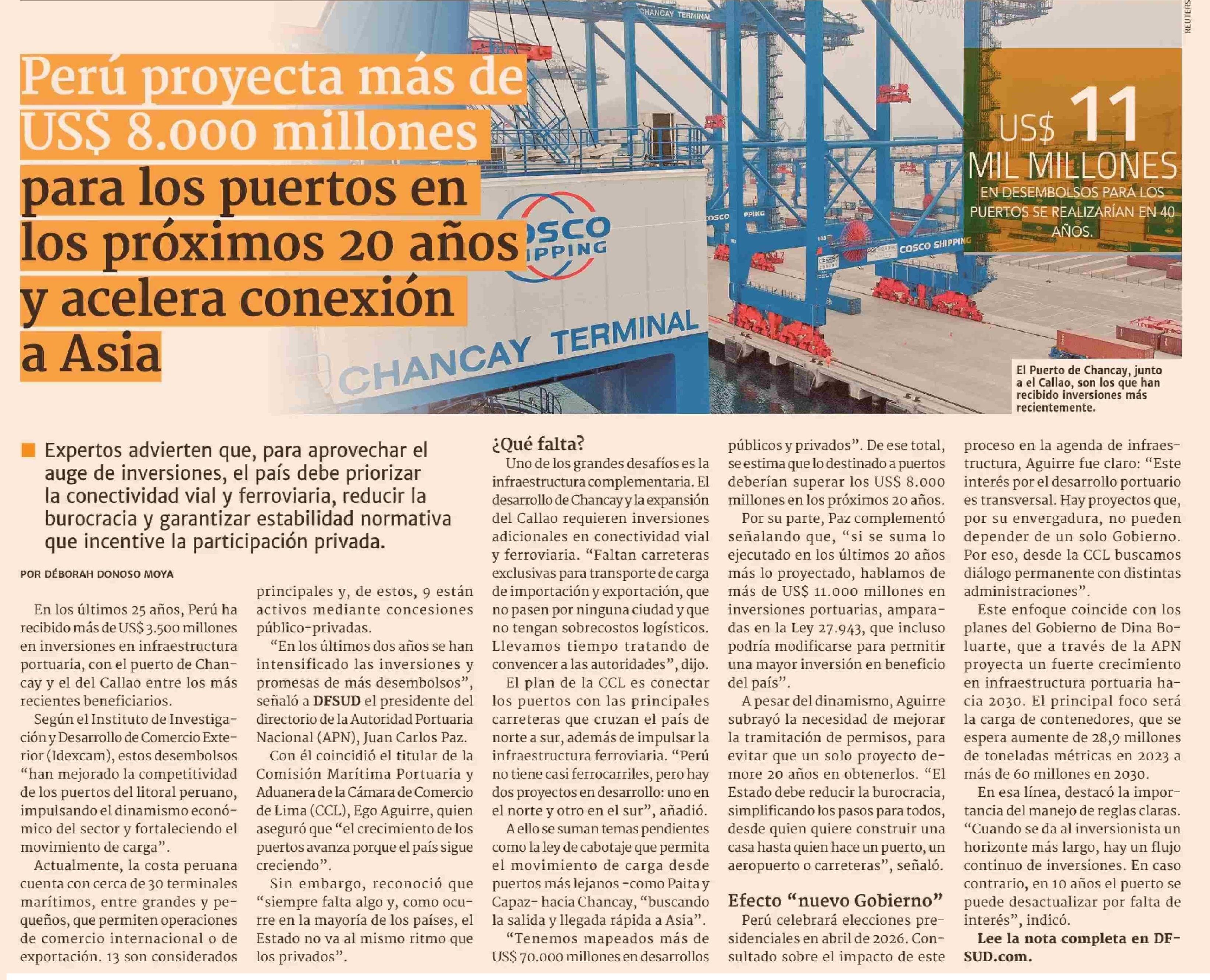 Perú proyecta más de US$ 8.000 millones para los puertos en los próximos años y acelera conexión a Asia 03-06-2025 Diario Financiero |