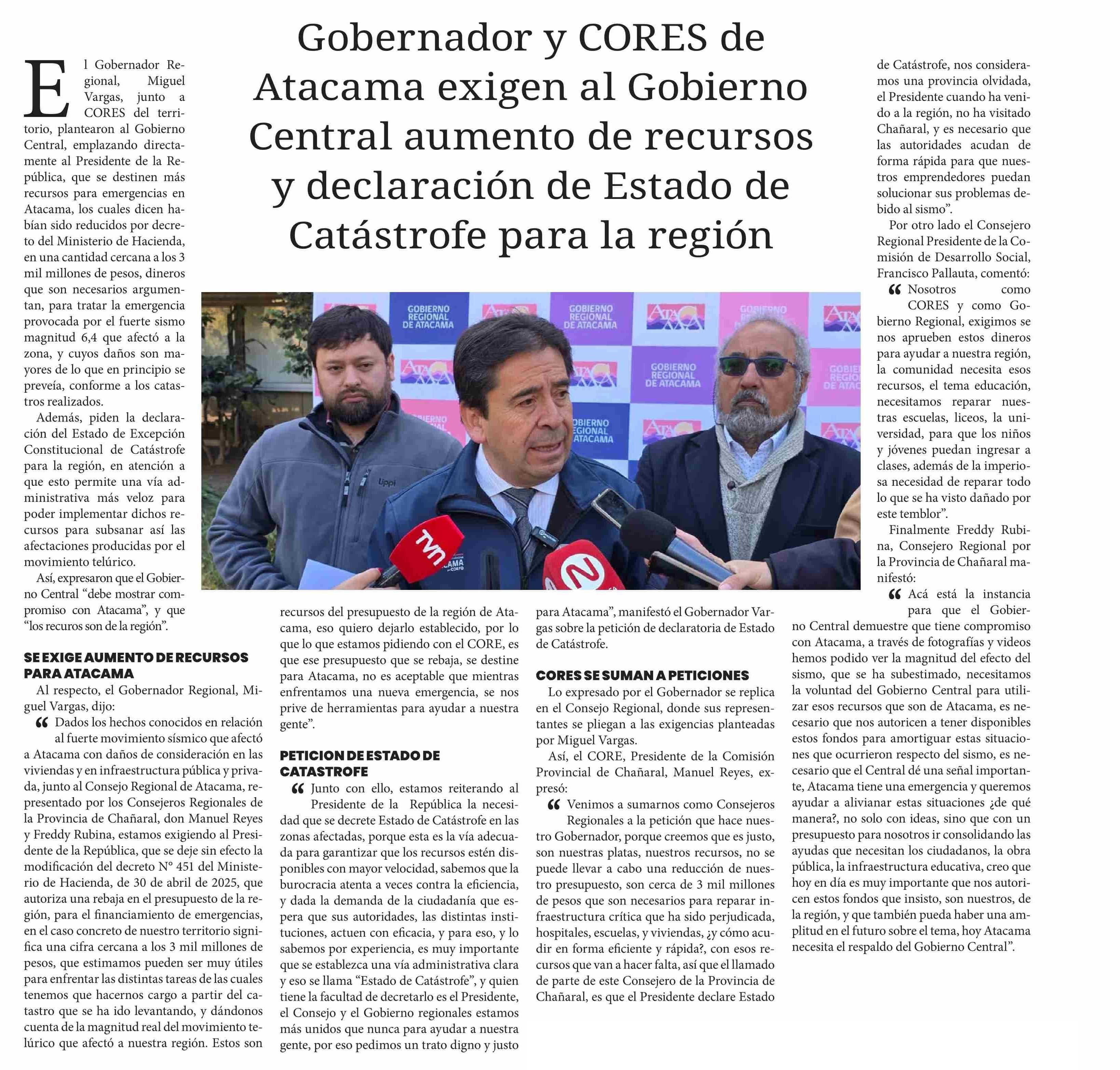 | Título: | Gobernador y CORES de Atacama exigen al Gobierno Central aumento de recursos y declaración de Estado de Catástrofe para la región |