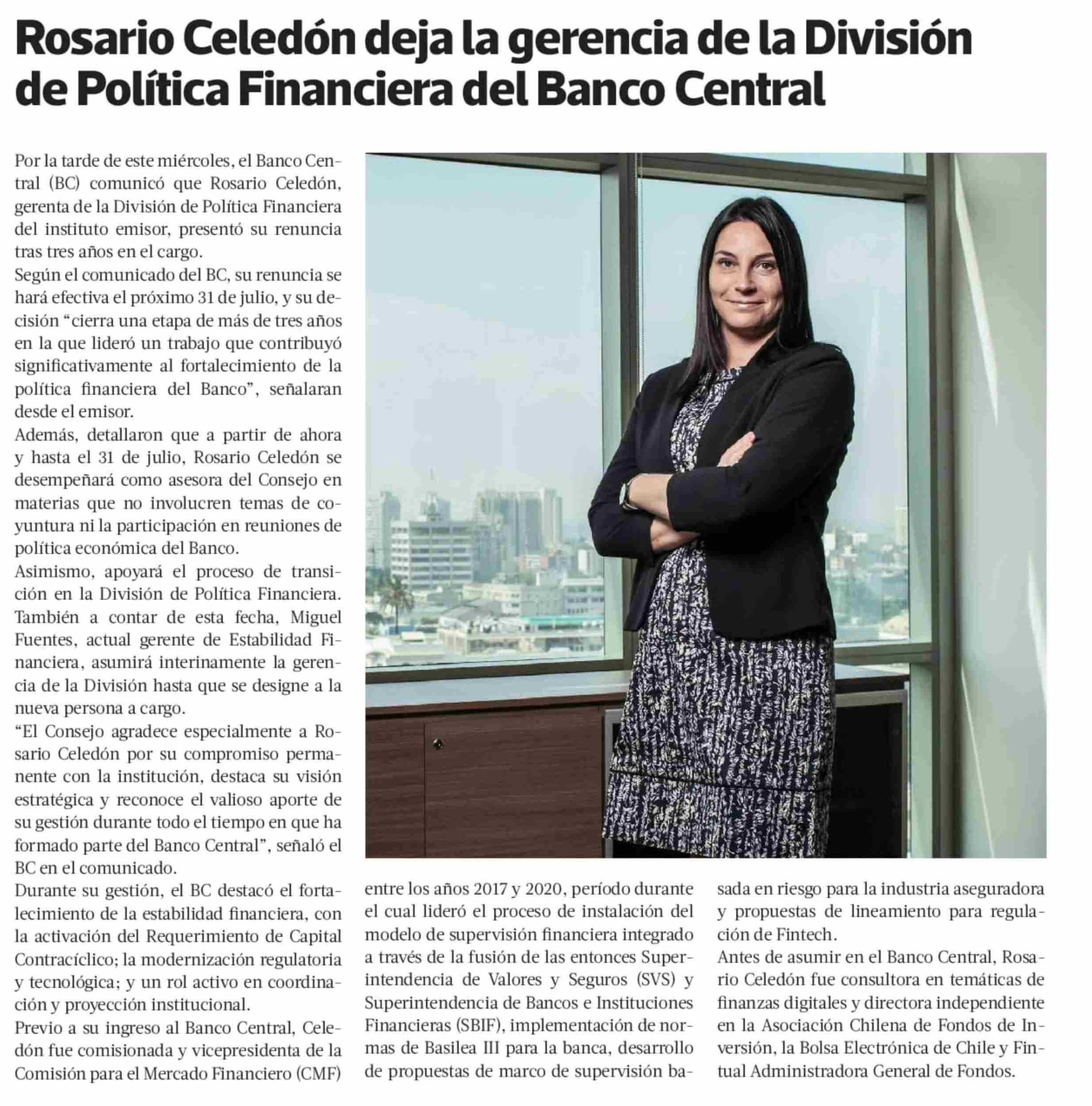Rosario Celedón deja la gerencia de la División de Política Financiera del Banco Central 12-06-2025 La Tercera |