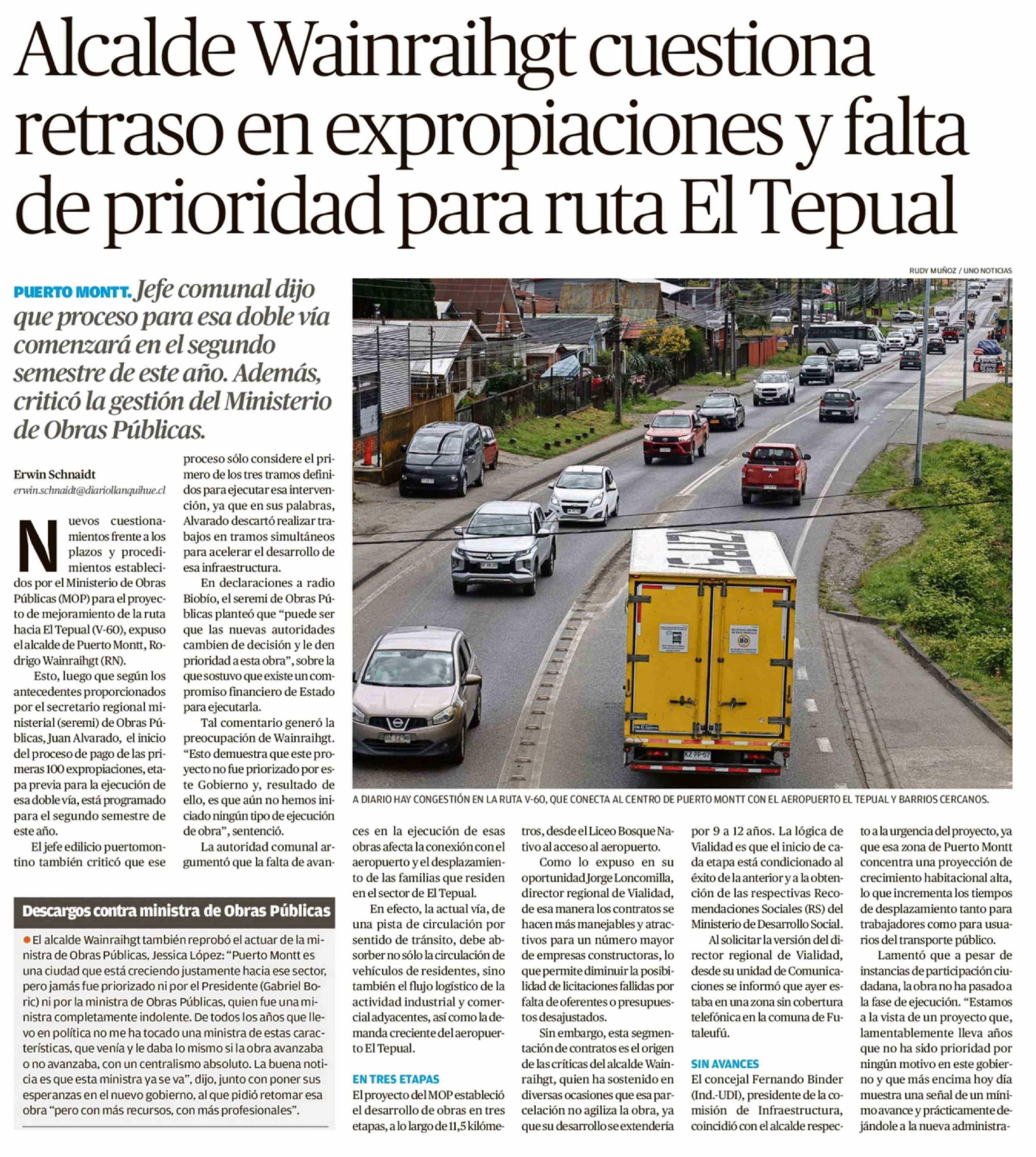 Título: Alcalde Wainraihgt cuestiona retraso en expropiaciones y falta de prioridad para ruta El Tepual