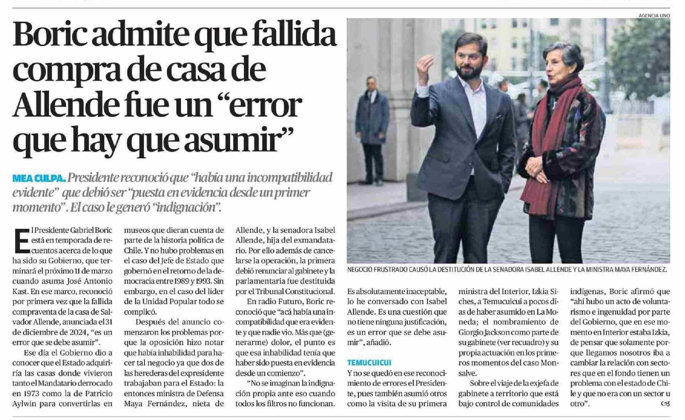 Boric admite que fallida compra de casa de Allende fue un "error que hay que asumir" 15-01-2026 El Mercurio de Calama |