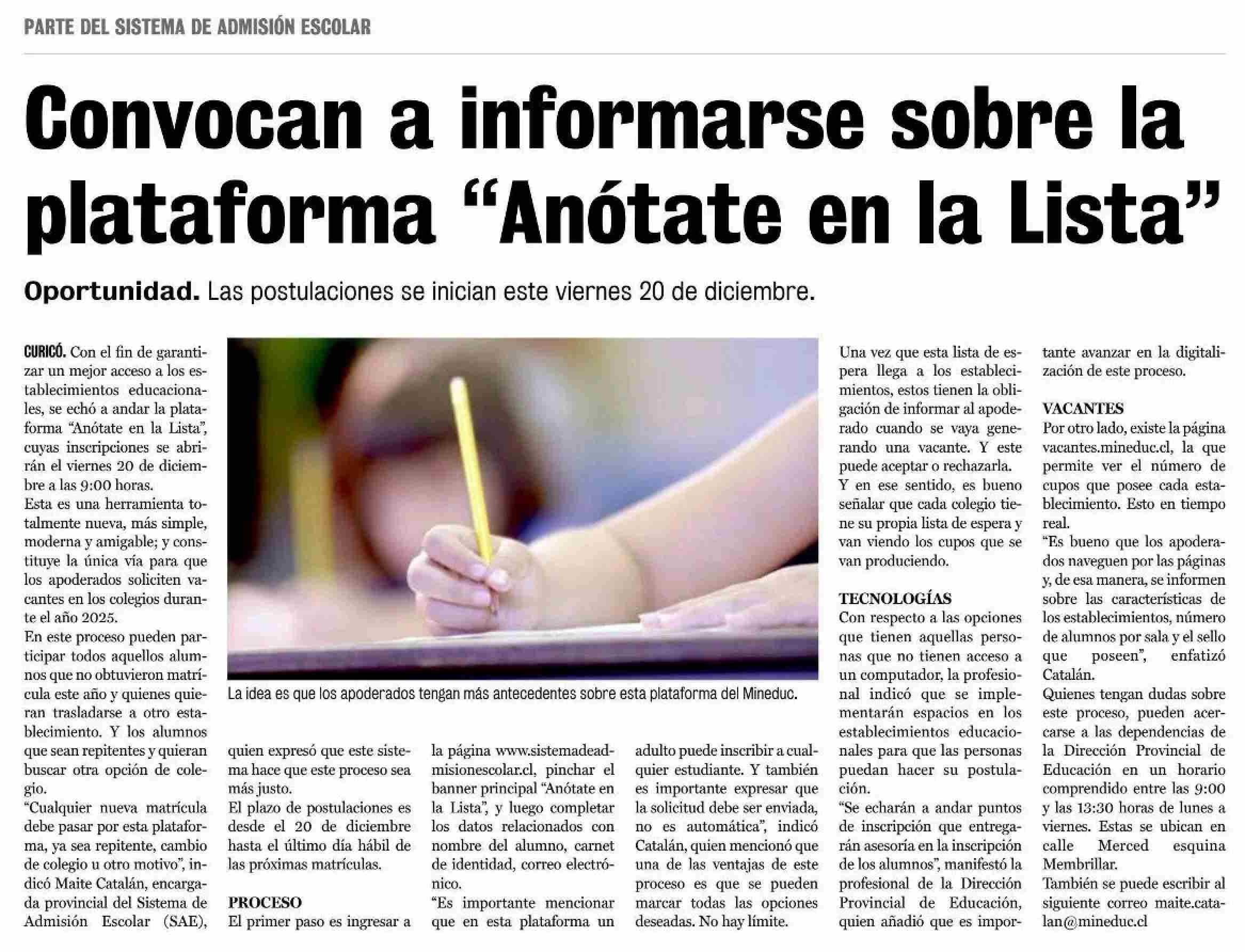 Convocan a informarse sobre la plataforma “Anótate en la Lista” 18-12-2024 La Prensa de Curicó |
